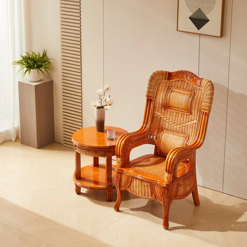 Natural Rattan High-Back Boss Chair with Double Cushions – Comfortable Single Leisure Chair for Home Use, Perfect for Relaxation and Lumbar Support