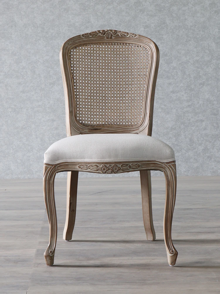 欧風ヴィンテージデザインの無垢材彫刻ダイニングチェア、レトロな藤編み背もたれと本革・麻のクッション付き!おしゃれで快適な座り心地を実現したデザイナーズチェアです。