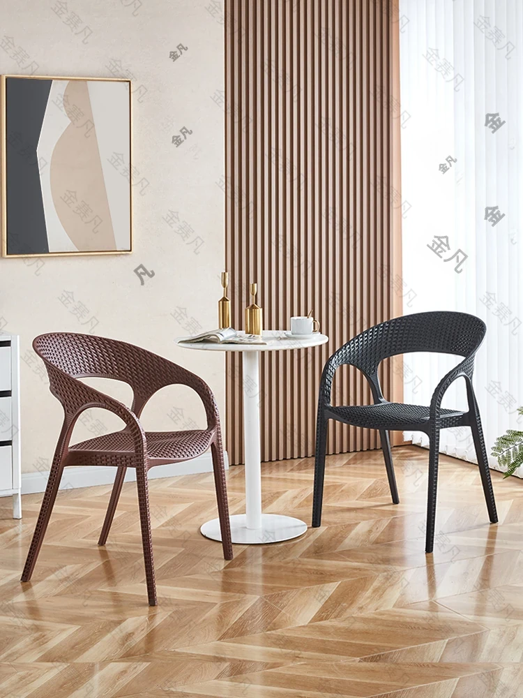 北欧スタイルの厚手プラスチック椅子 - 屋外・家庭用に最適なラタン風ダイニングチェア。バルコニーやカフェにぴったり!アーム付きで快適、スタッキング可能で収納も簡単!