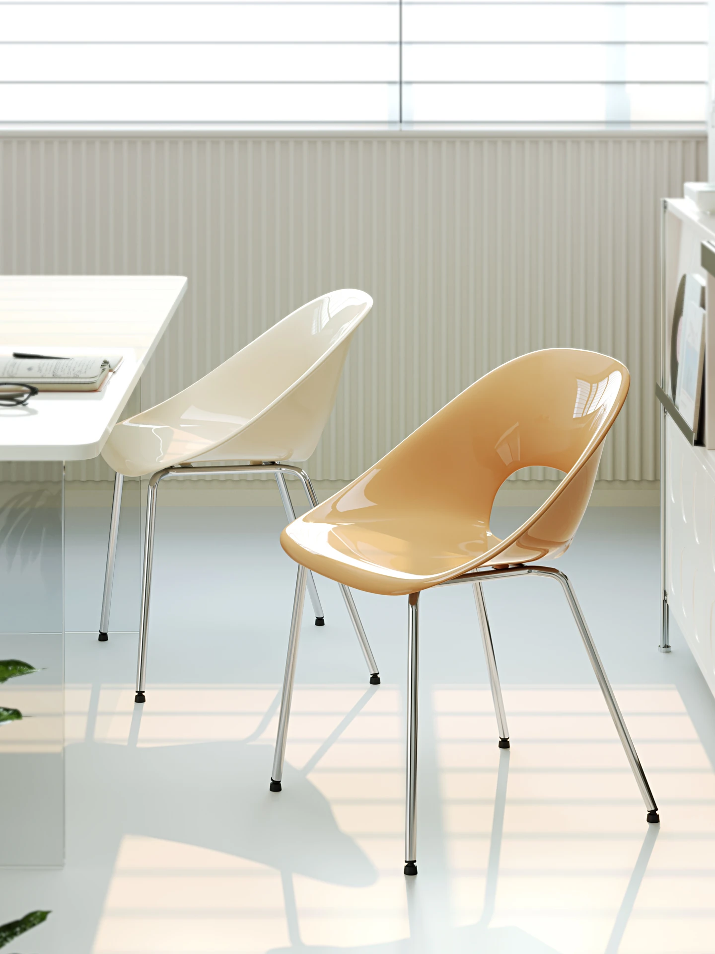 クリーミーなデザインのダイニングチェア - モダンでシンプルな背もたれ付き、トレンディなカフェやレストランに最適なプラスチック製。おしゃれな家庭用にもぴったり!
