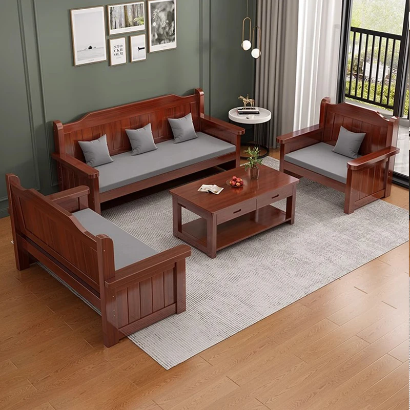Modern Solid Wood Sofa Set for Living Room - Minimalist Style, Perfect for Home Use, Includes Single and Double Chairs, New Chinese Aesthetic, Comfortable Backrest, Four Seasons Long Bench