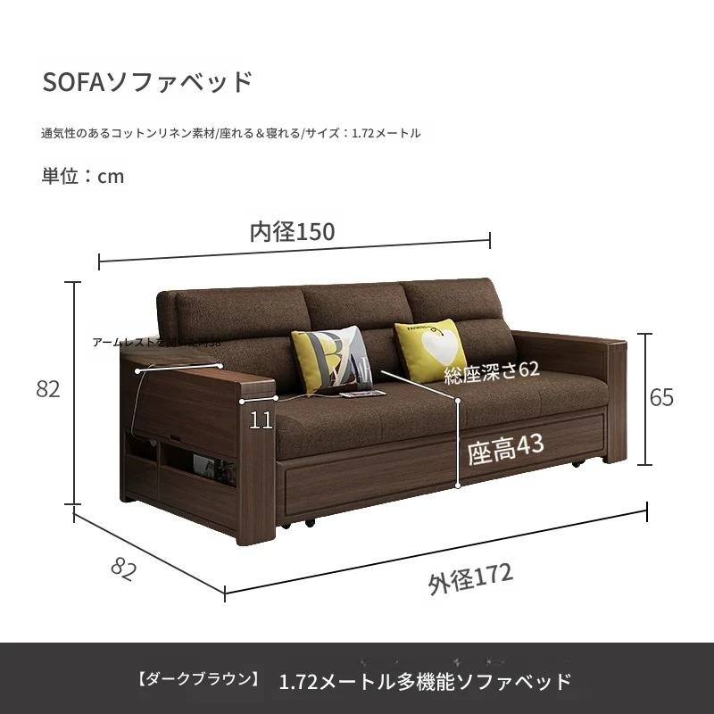 【ダークブラウン】1.72メートル多機能ソファベッド
