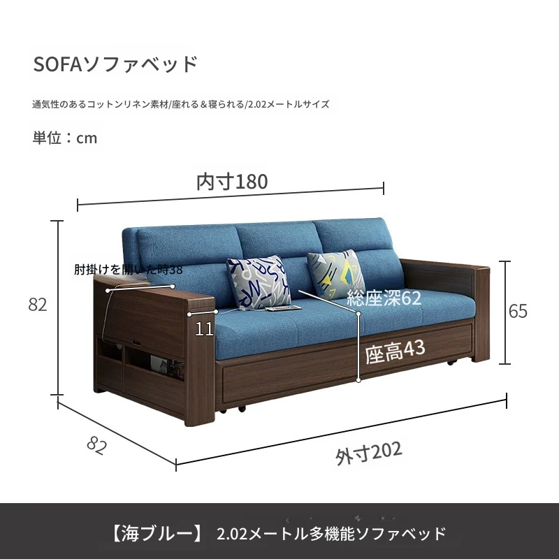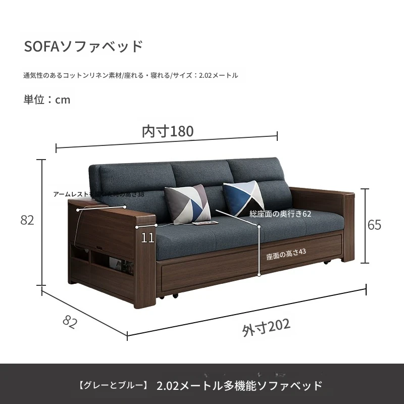 【グレー×ブルー】2.02メートル多機能ソファベッド