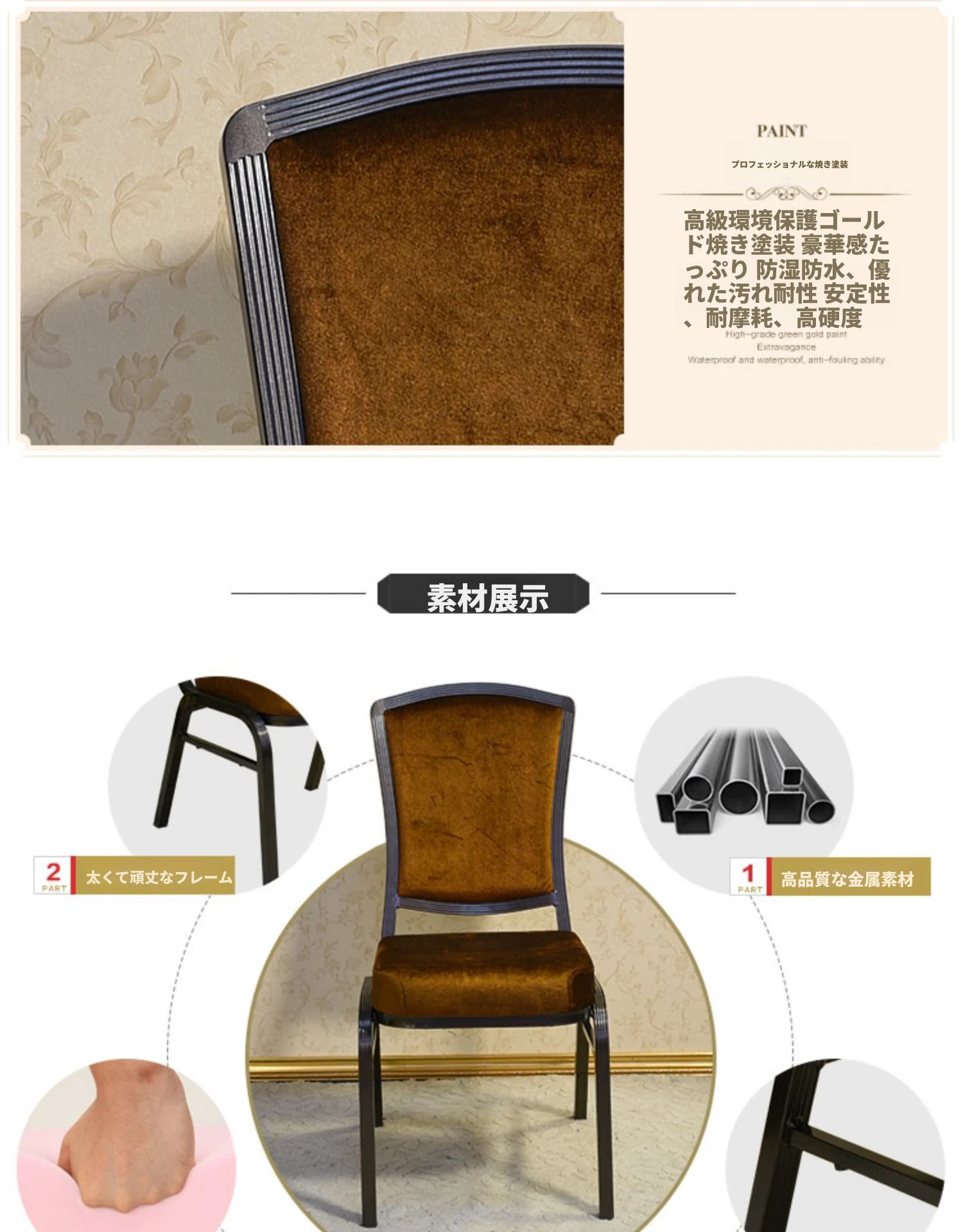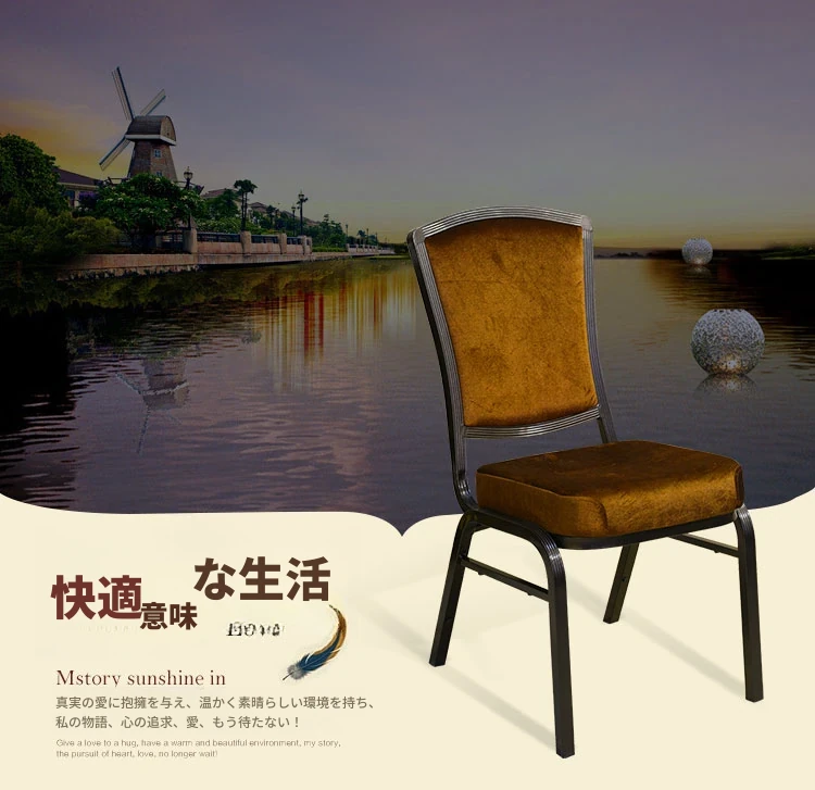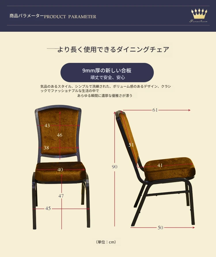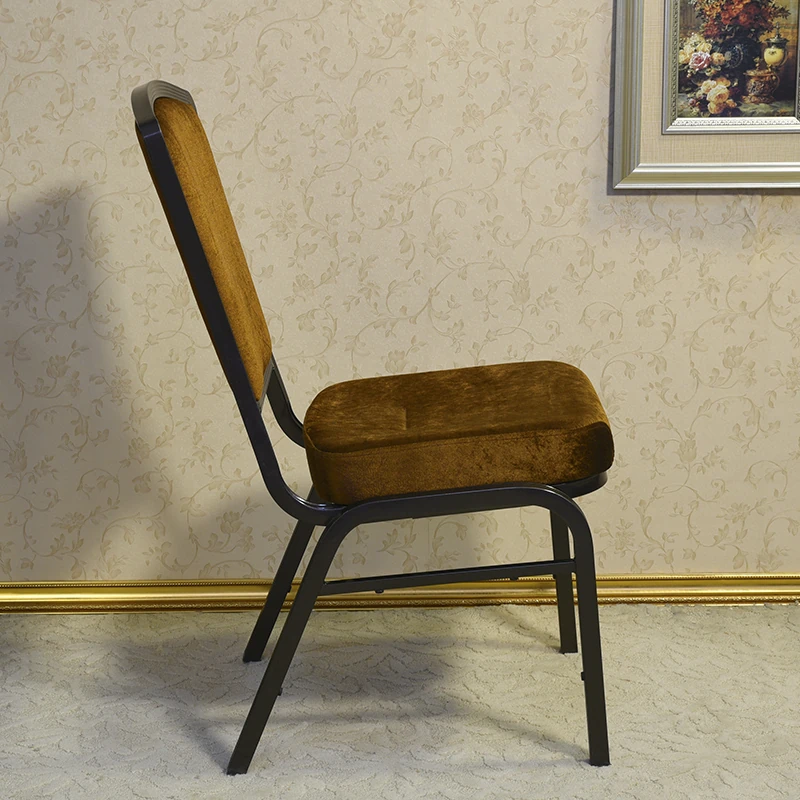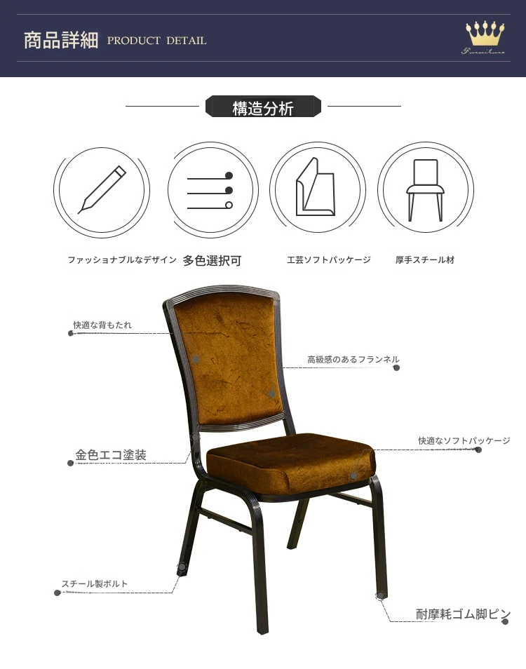 深いコーヒー色の布製クラウンチェア - ホテルロビーやカフェに最適!スタッキング可能な将軍椅子、朝食店や宴会にぴったり。おしゃれで実用的なデザインで、どんな空間にもマッチします!
