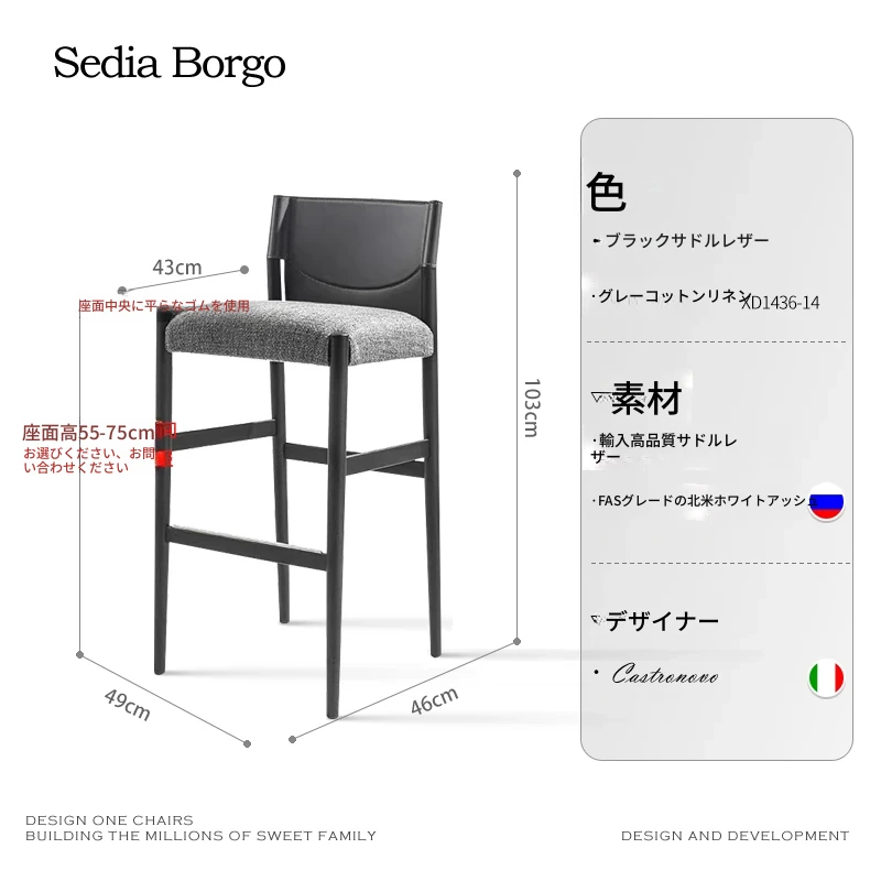 【カスタムバースツール】ホワイトアッシュブラック+サドルレザー+ダークグレーコットンリネン【座面高55-75はカスタマーサービスに確認】