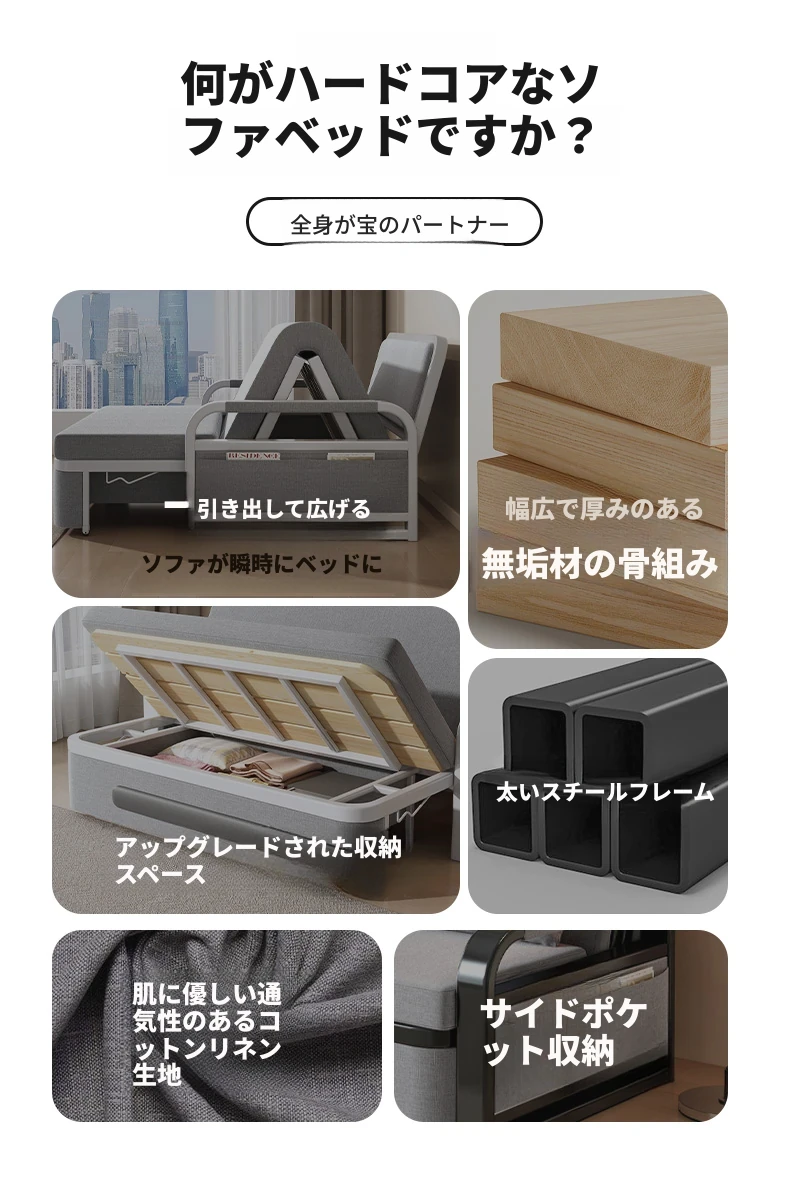 全実木の引き出し式ソファベッド - シンプルでコンパクトなデザイン、リビングルームや小さな部屋に最適!折りたたみ可能で、使い方自由自在。原木の温もりを感じる快適な空間を演出します。