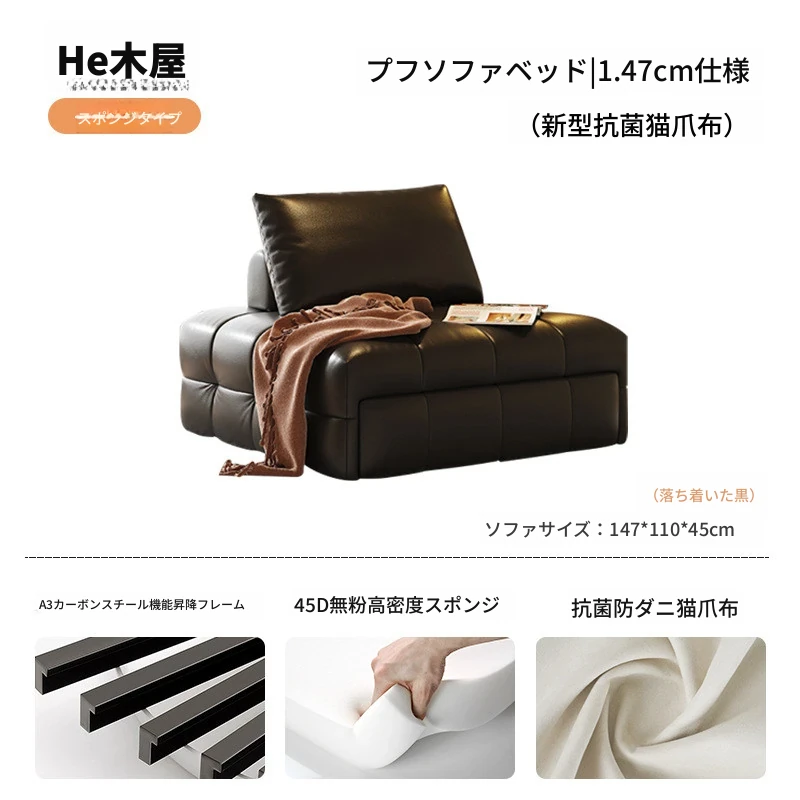 1.47mソファベッド(在庫あり)【猫爪皮-落ち着いた黒】