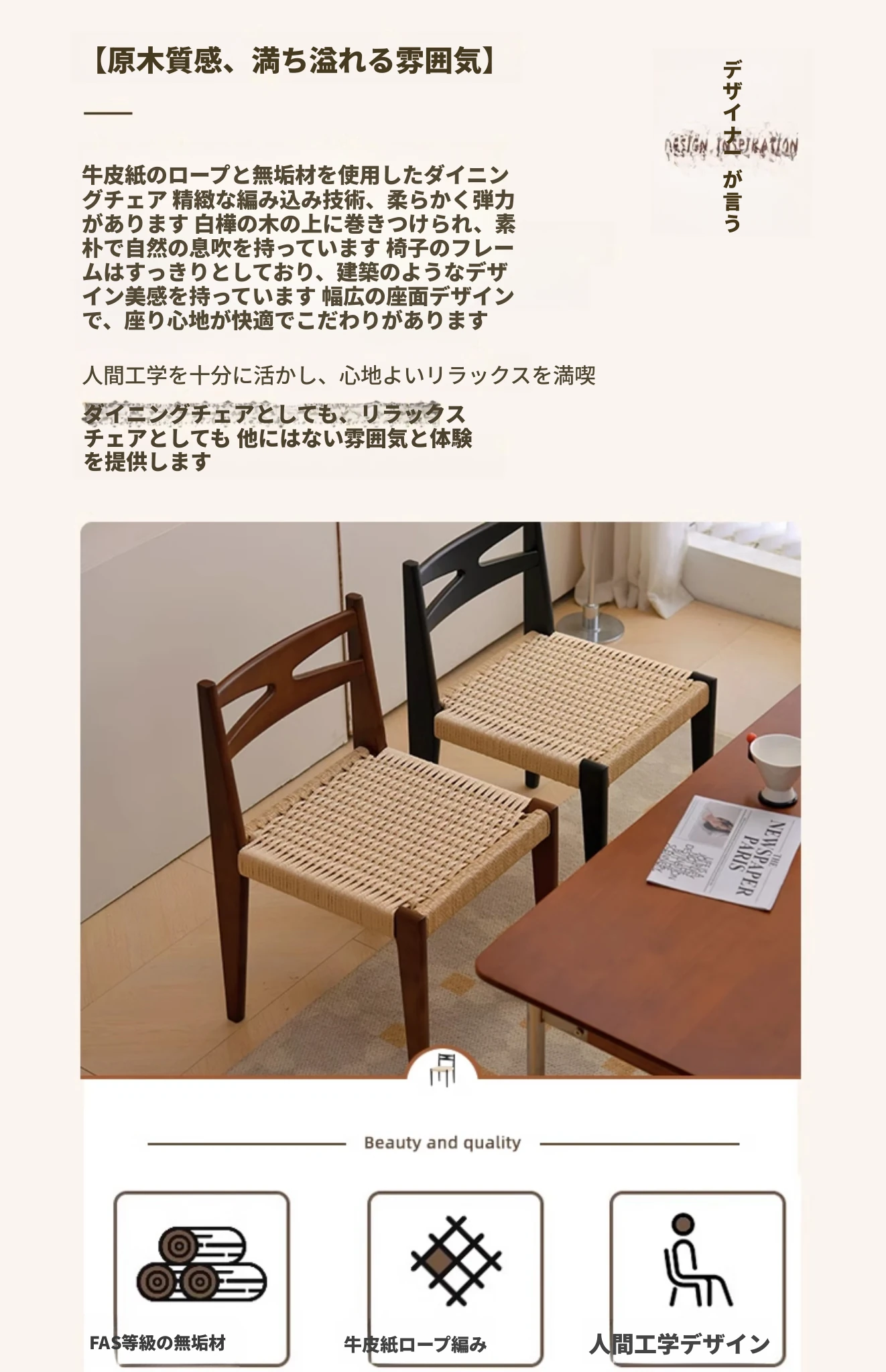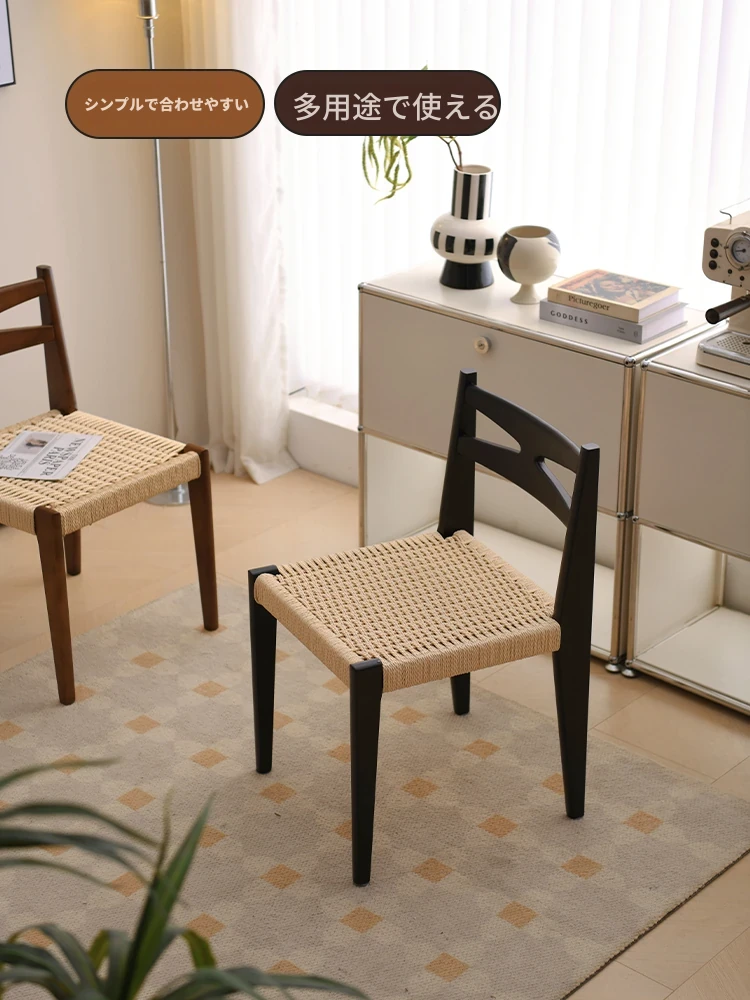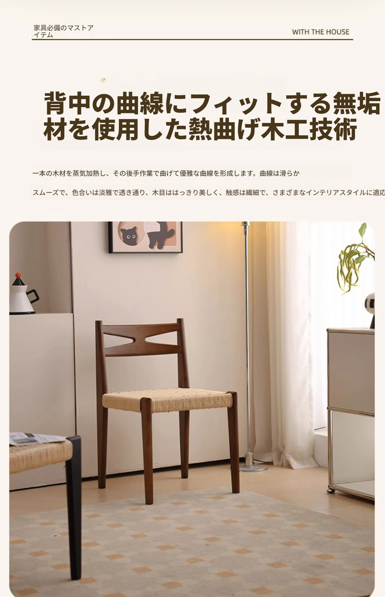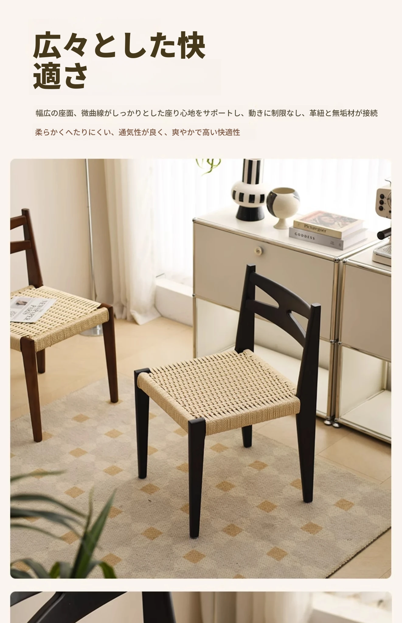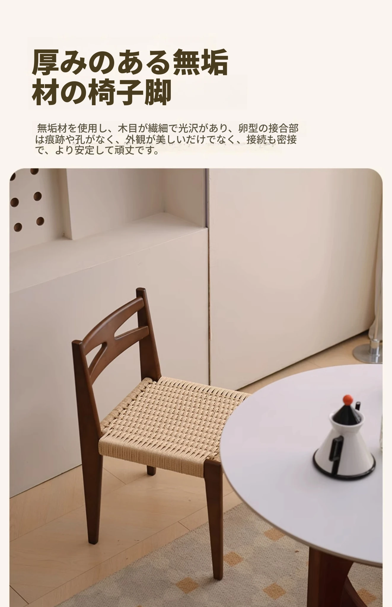 和モダンな侘寂スタイルの無垢材ダイニングテーブル&椅子セット、麻ロープ編みのウィッジチェア、ブラックウォールナットの背もたれ付き。フランス風のヴィンテージデザインで、家庭にぴったりのエレガントな雰囲気を演出します。