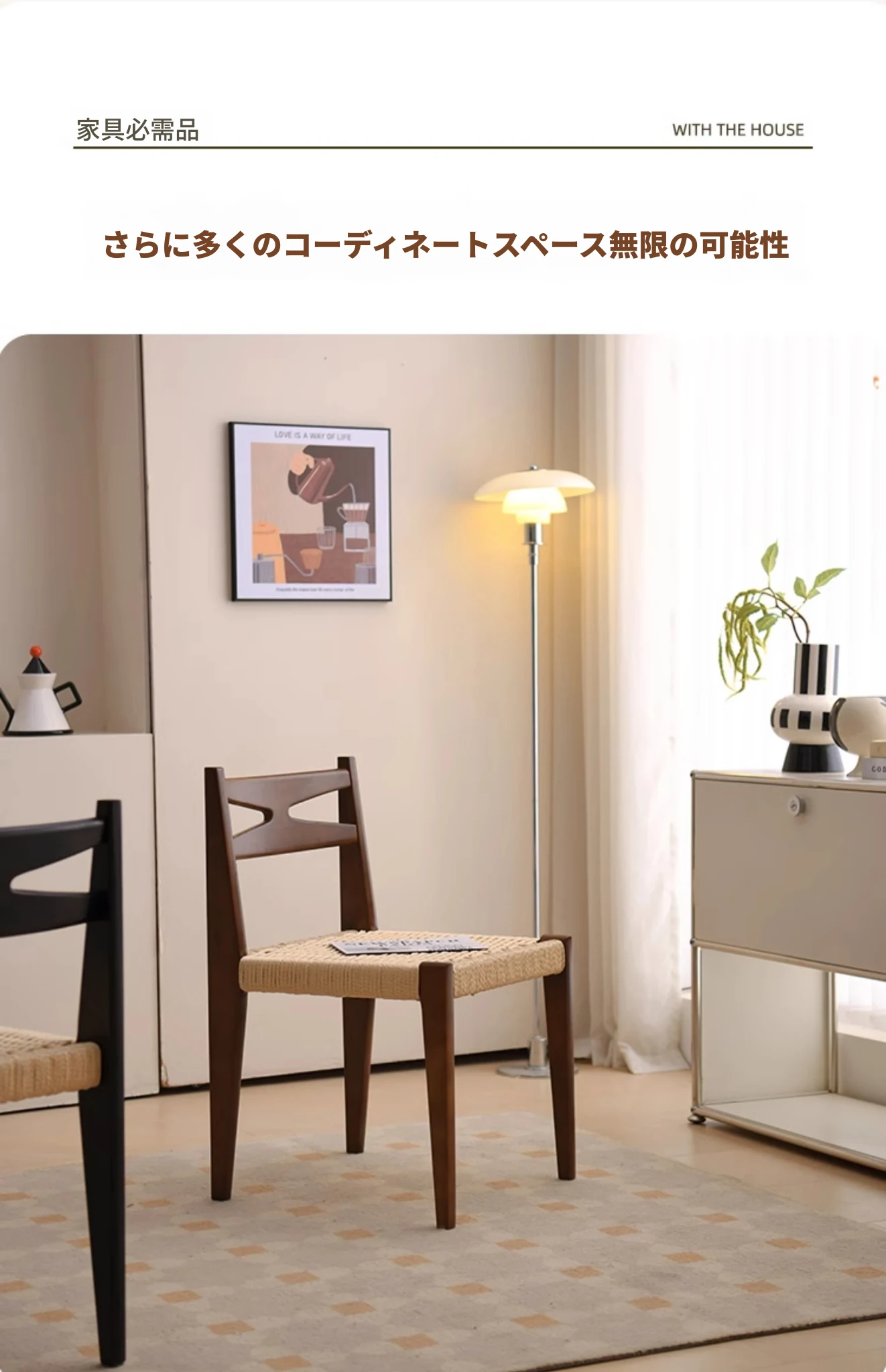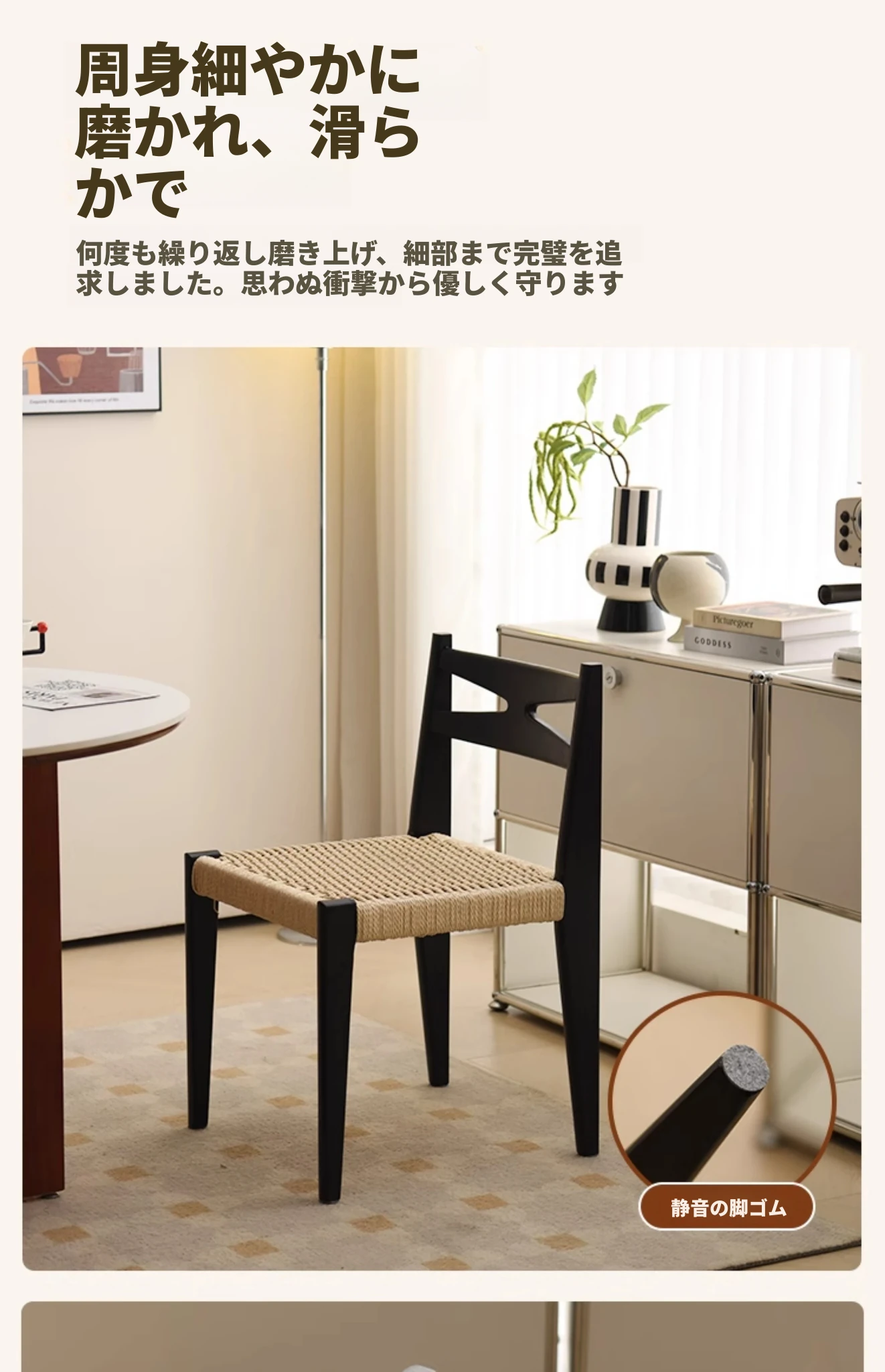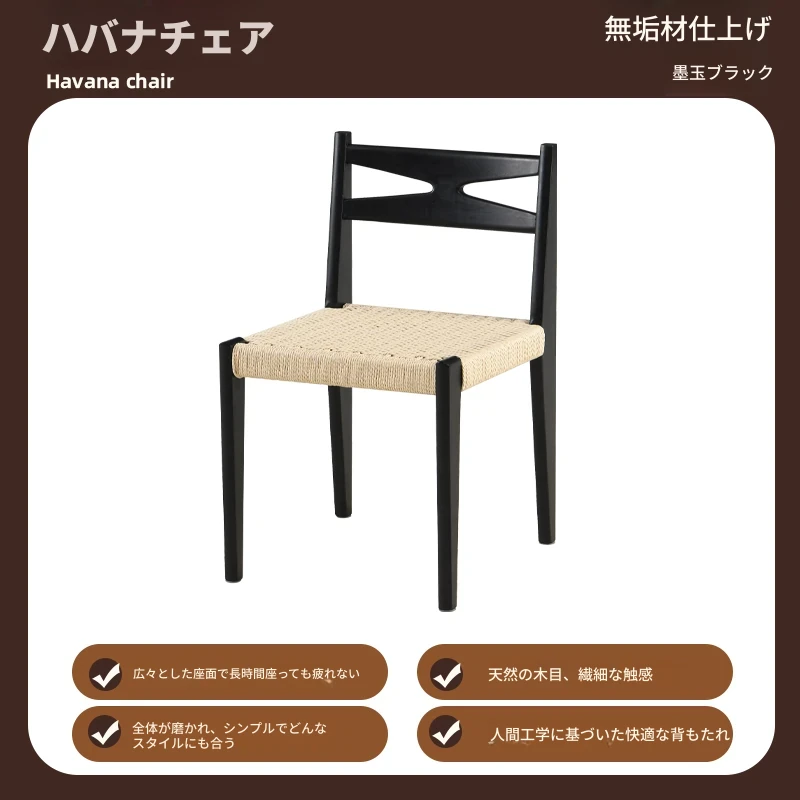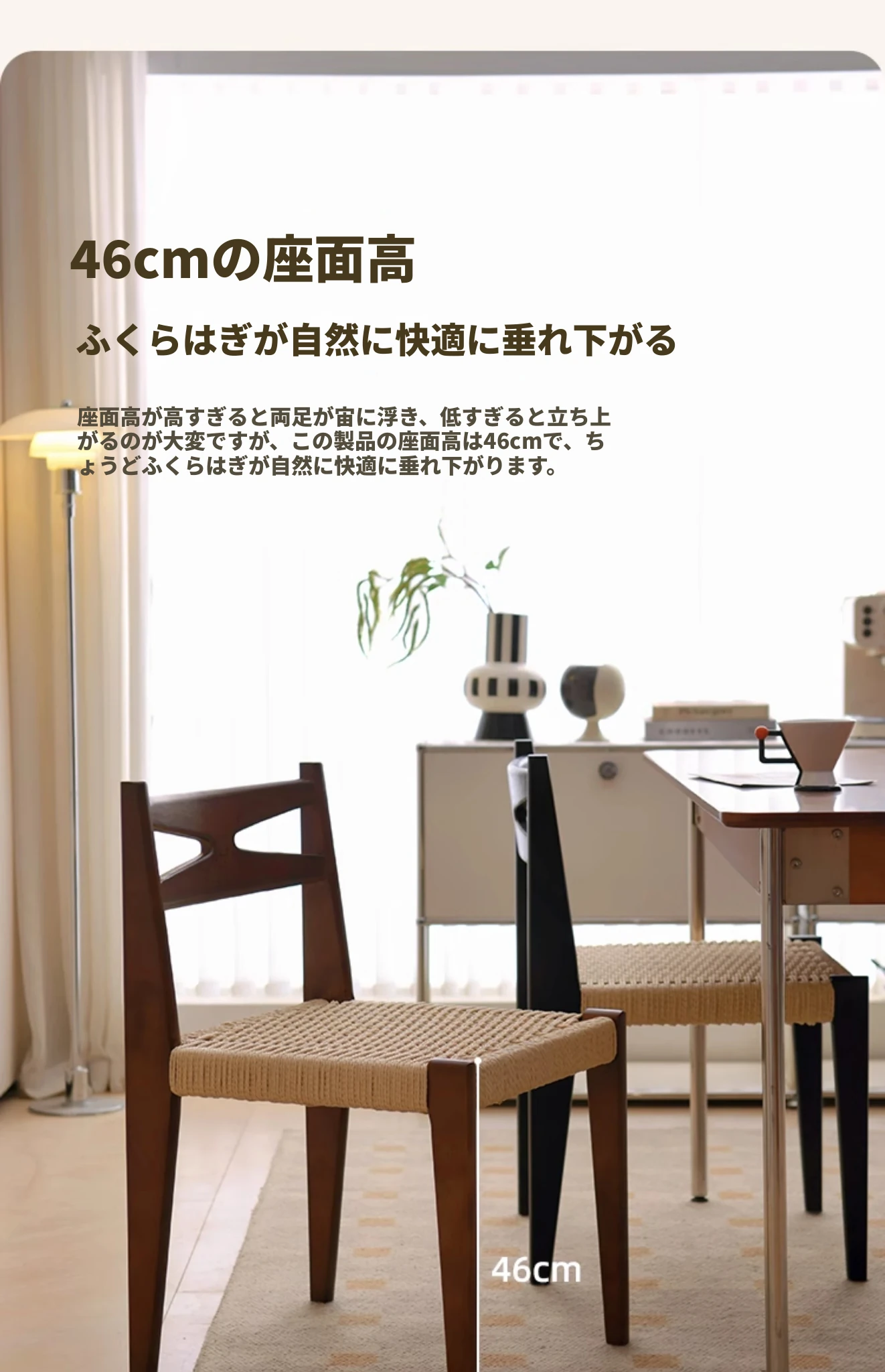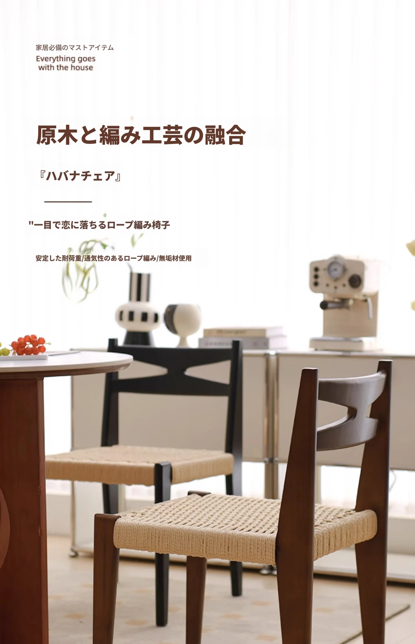 和モダンな侘寂スタイルの無垢材ダイニングテーブル&椅子セット、麻ロープ編みのウィッジチェア、ブラックウォールナットの背もたれ付き。フランス風のヴィンテージデザインで、家庭にぴったりのエレガントな雰囲気を演出します。