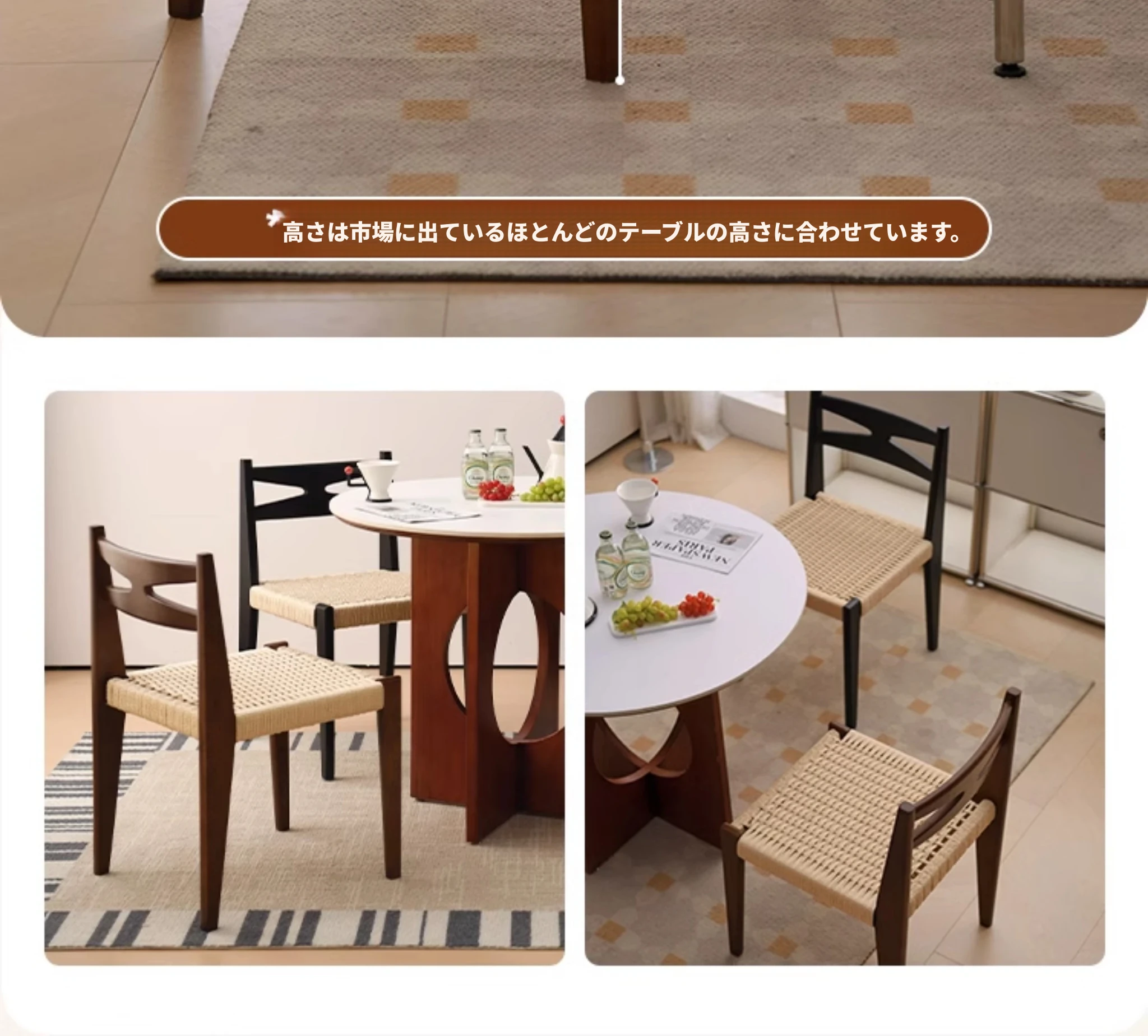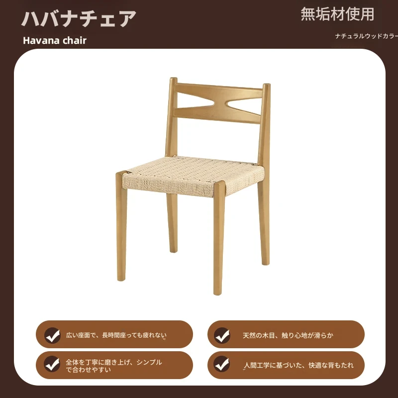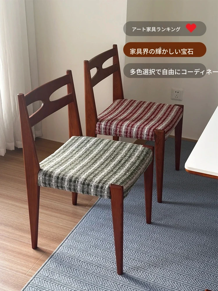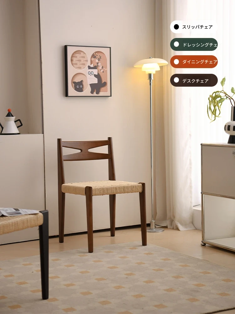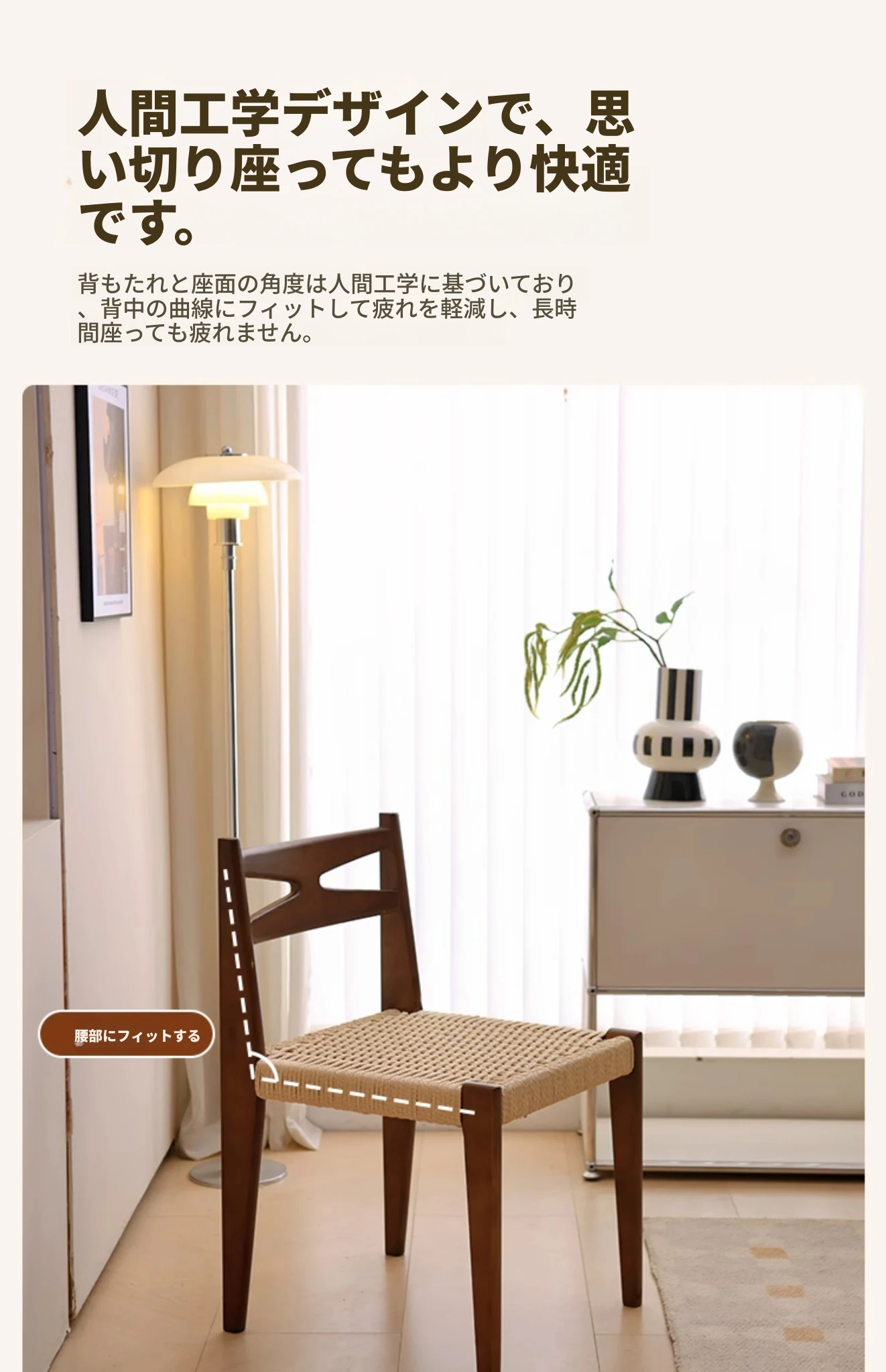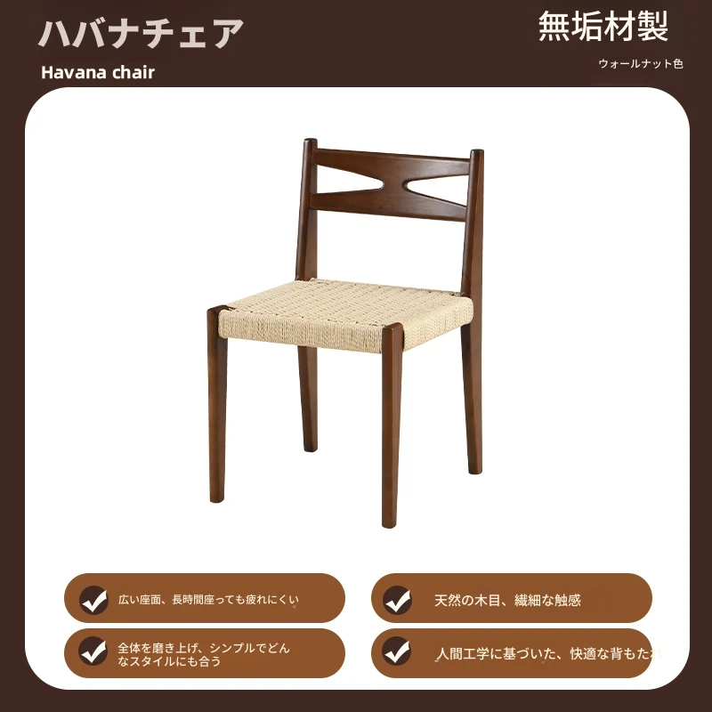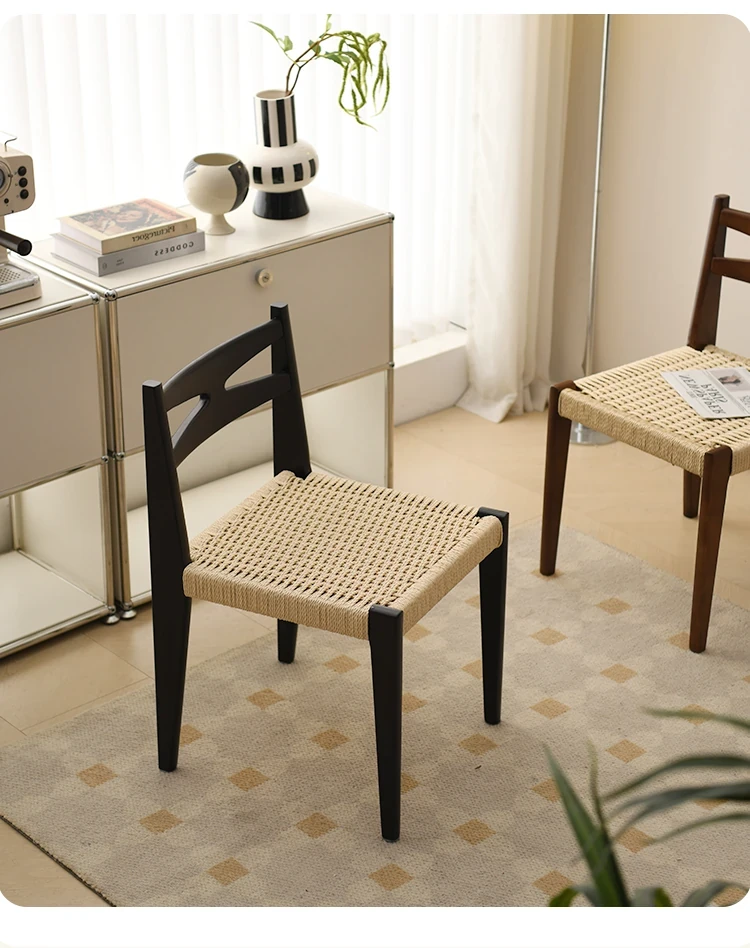 和モダンな侘寂スタイルの無垢材ダイニングテーブル&椅子セット、麻ロープ編みのウィッジチェア、ブラックウォールナットの背もたれ付き。フランス風のヴィンテージデザインで、家庭にぴったりのエレガントな雰囲気を演出します。
