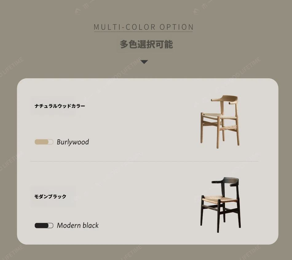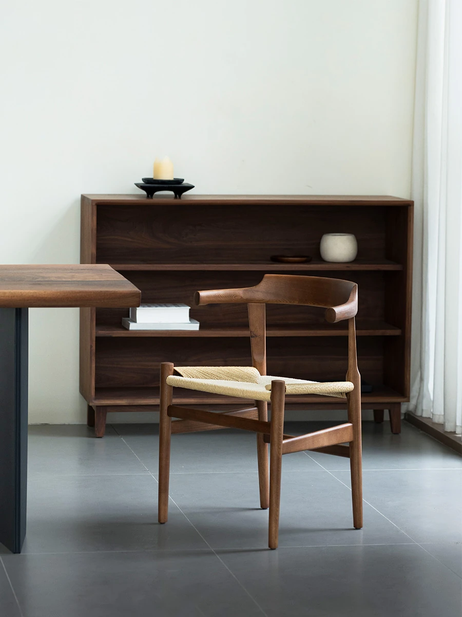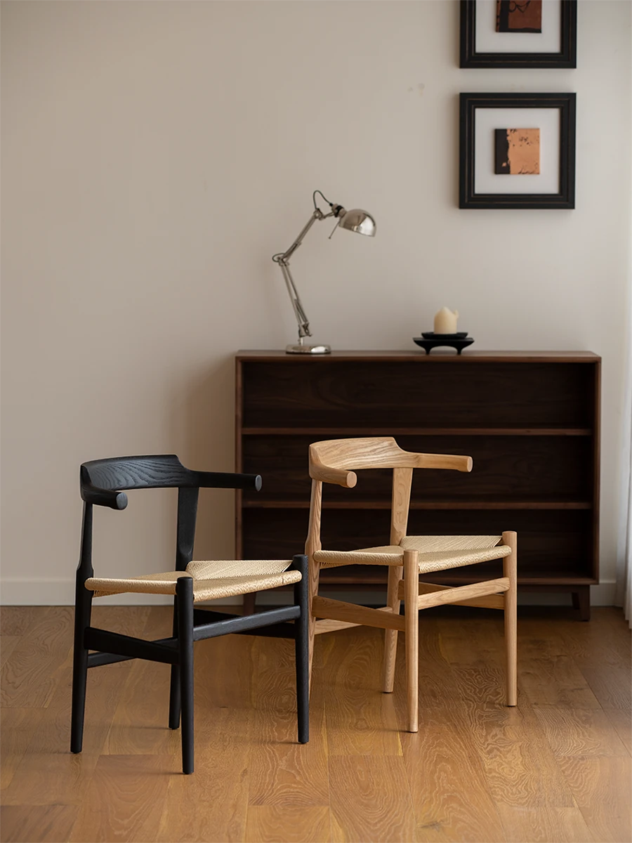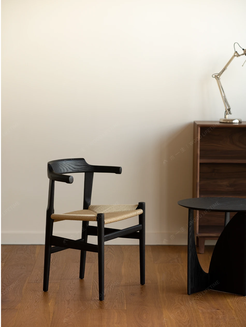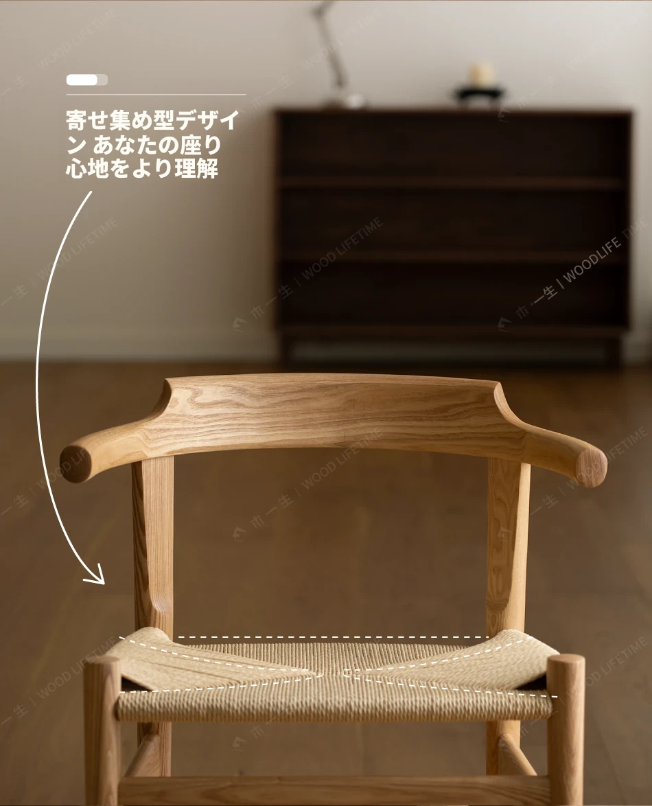 北欧スタイルの全木製ダイニングチェア - モダンでシンプルなデザイン、リラックスできるカウホーンチェア!カフェや家庭での食事に最適、スタイリッシュな背もたれ付き。あなたの空間をおしゃれに彩ります!