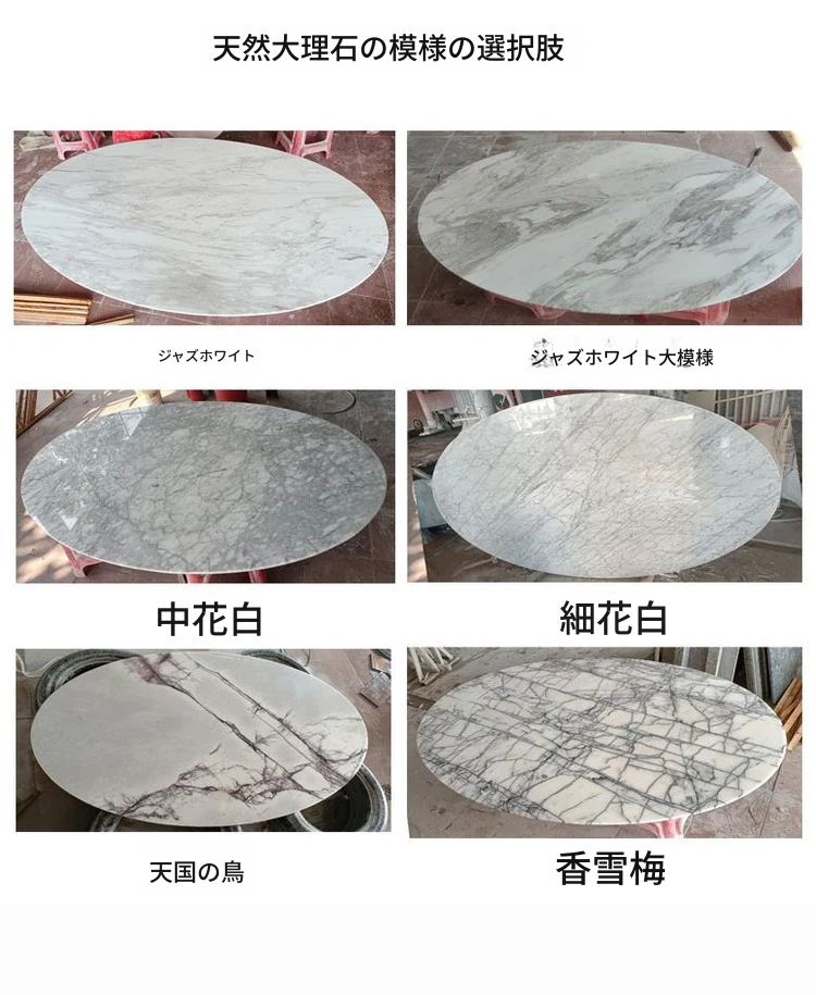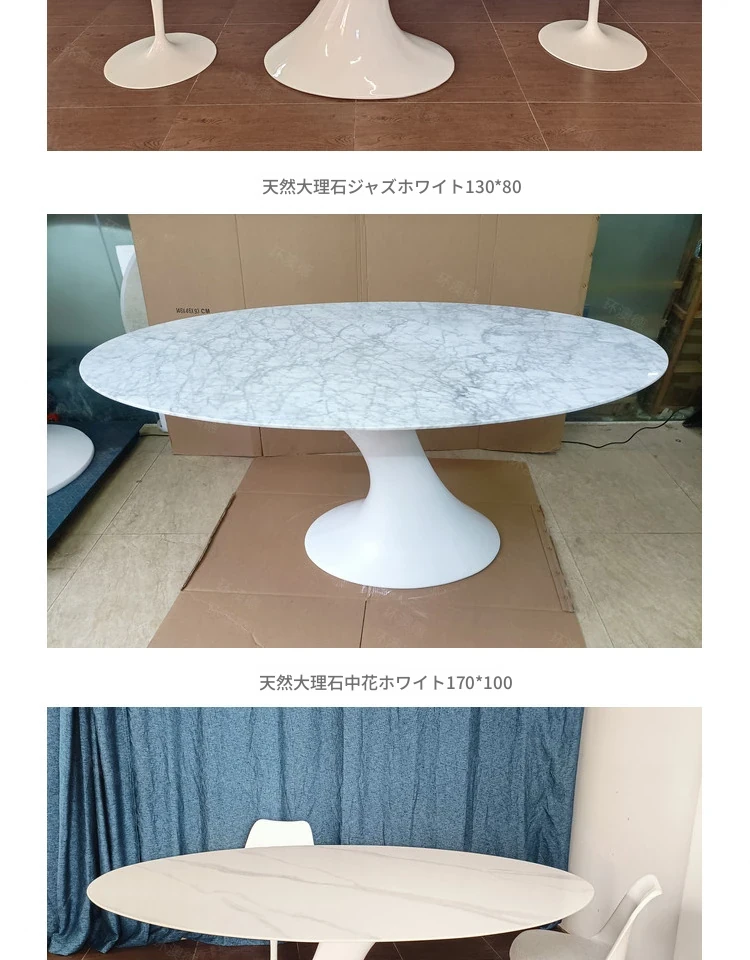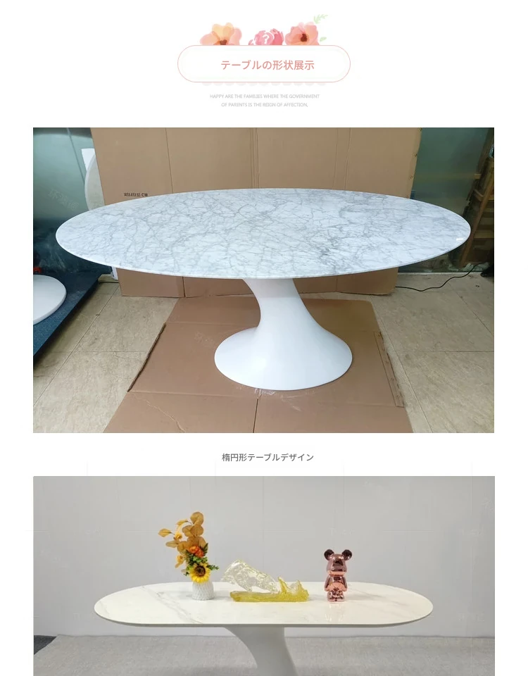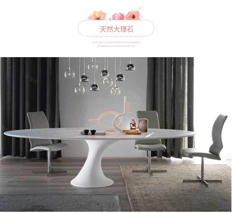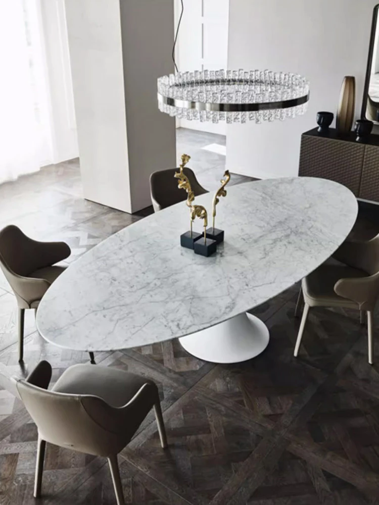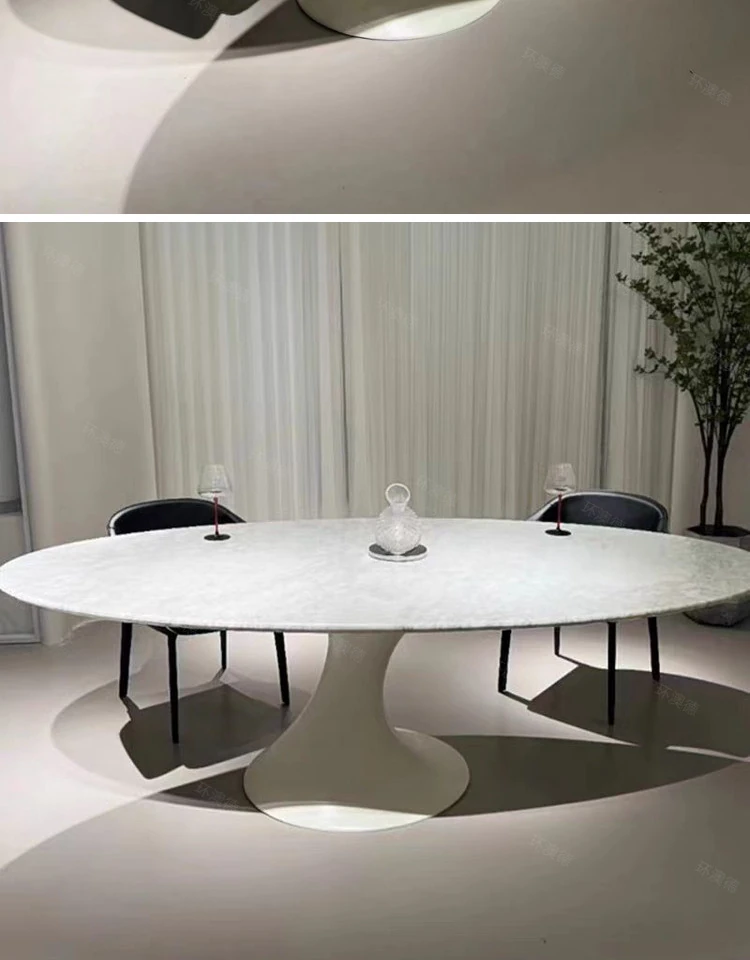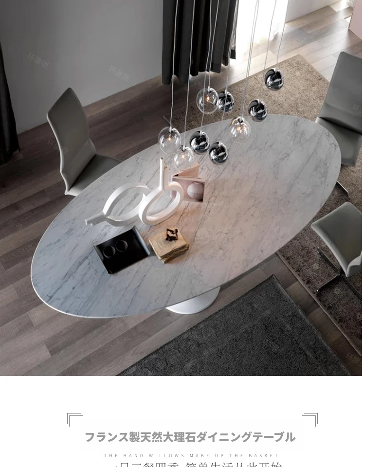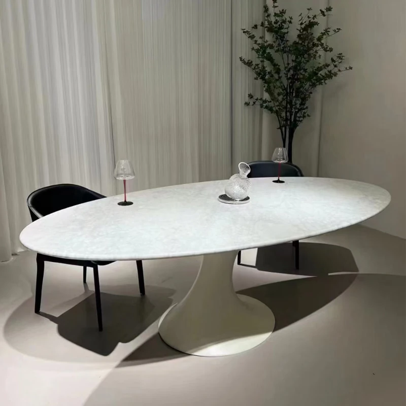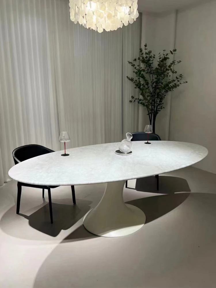 天然大理石のフランス風レトロデザイン、エレガントな楕円形の水滴型ドルフィンダイニングテーブル。洗練されたインテリアにぴったりのデザイナーズフライングソーサーテーブル。