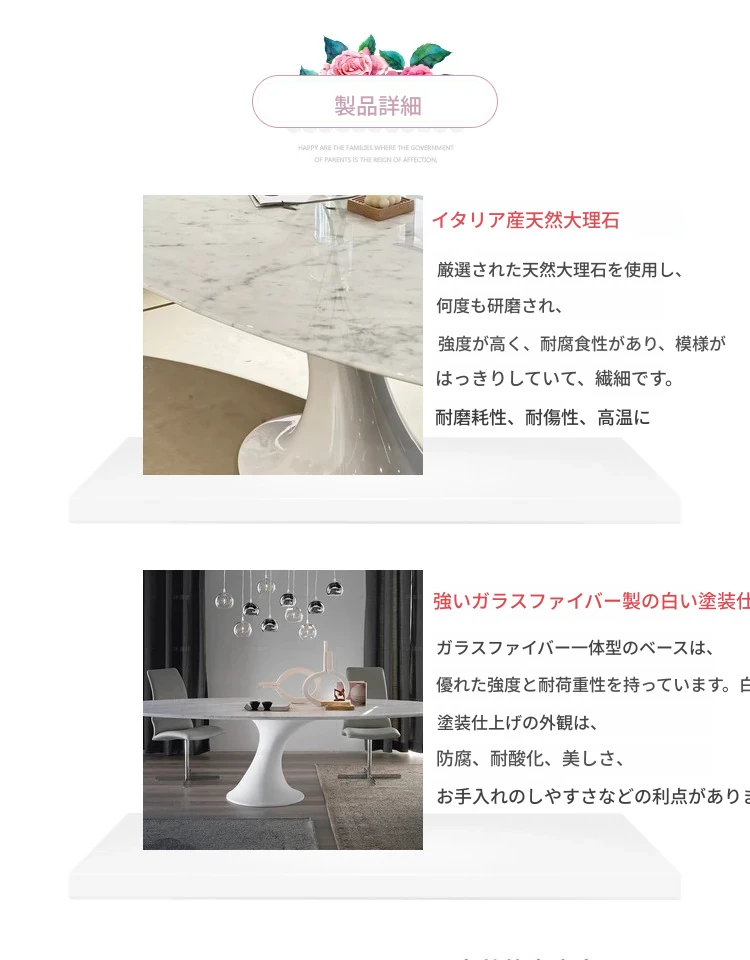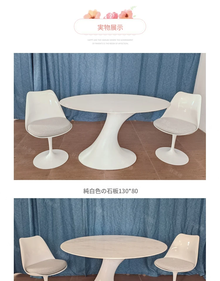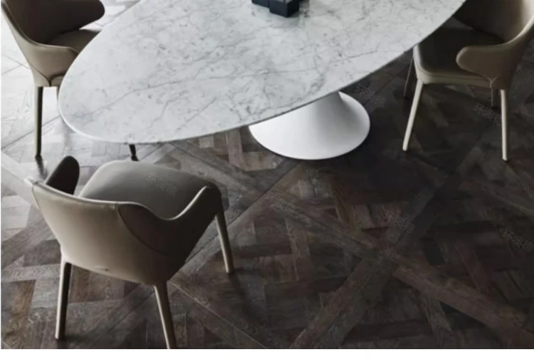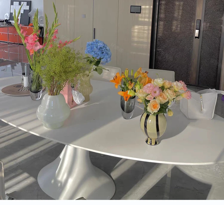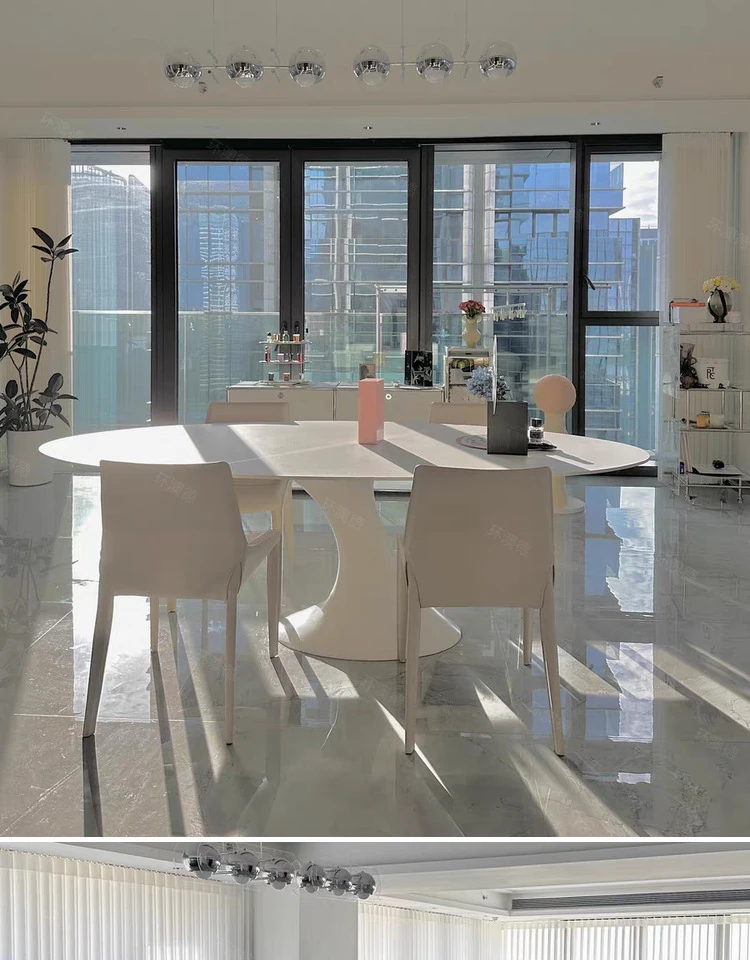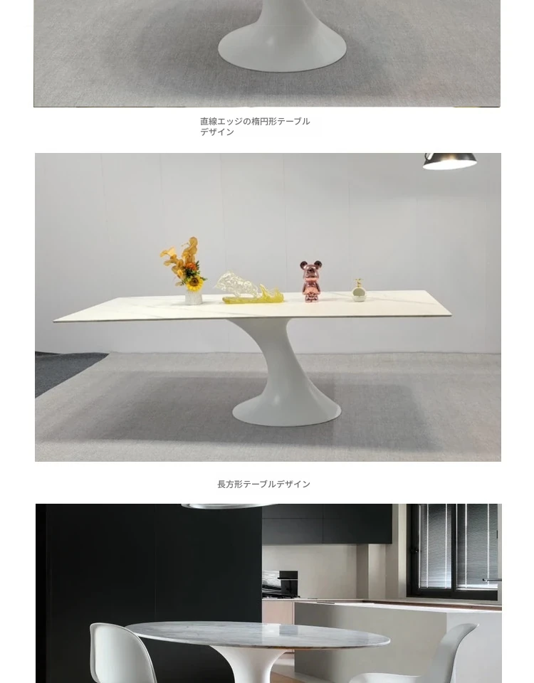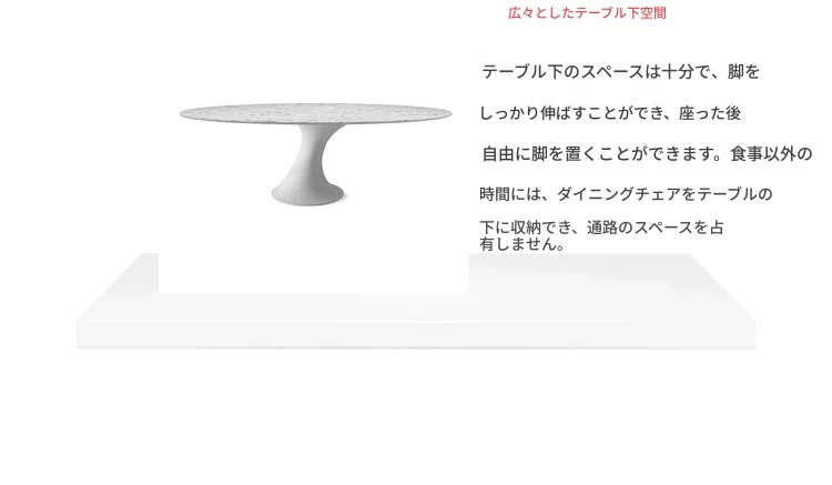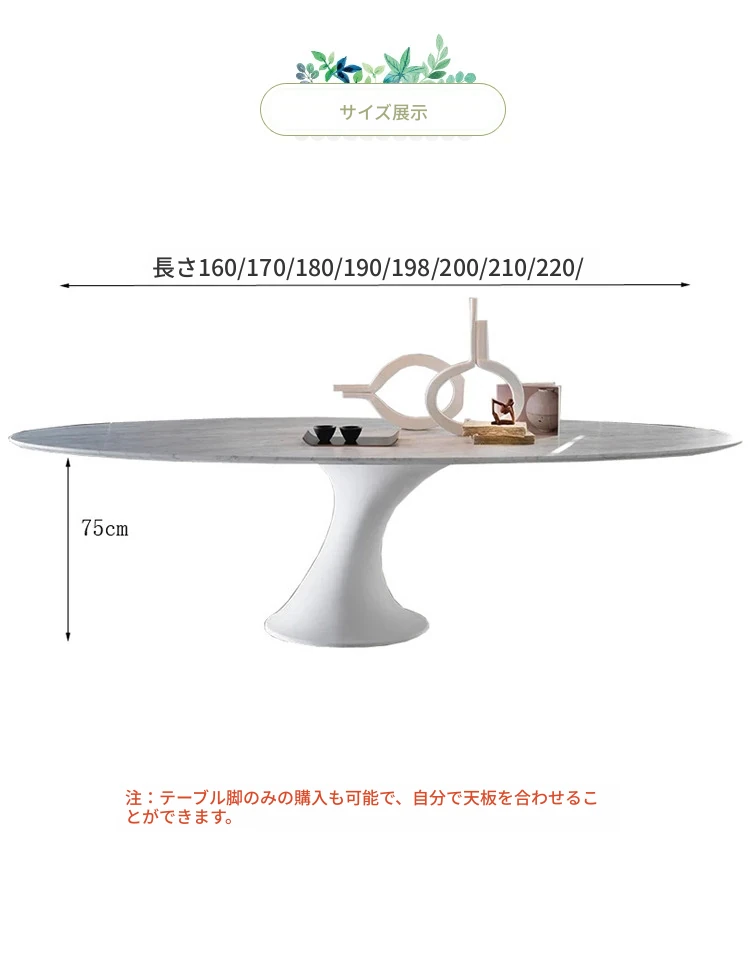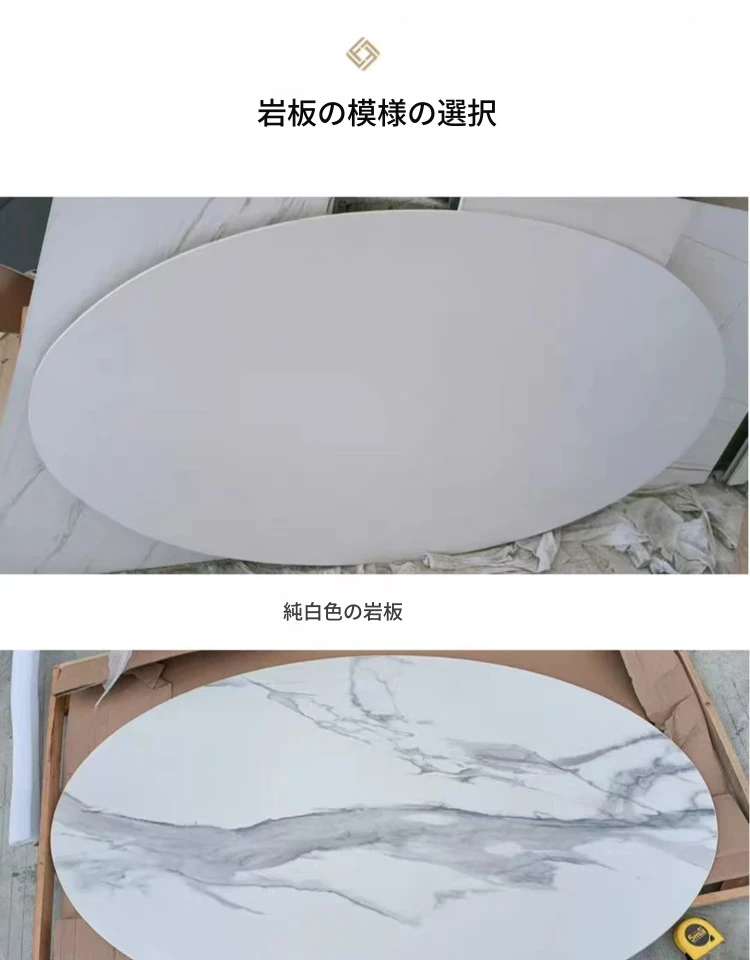 天然大理石のフランス風レトロデザイン、エレガントな楕円形の水滴型ドルフィンダイニングテーブル。洗練されたインテリアにぴったりのデザイナーズフライングソーサーテーブル。