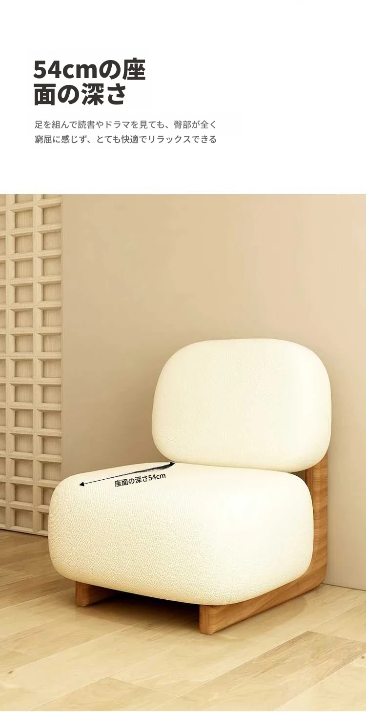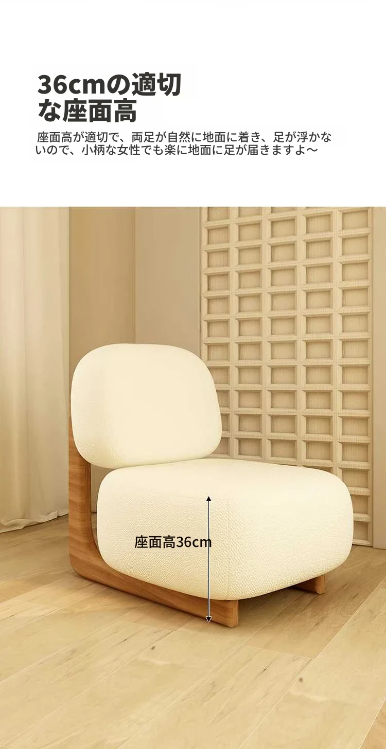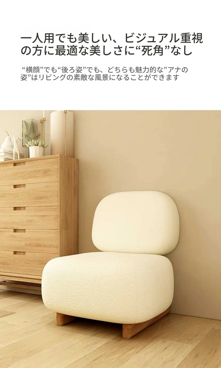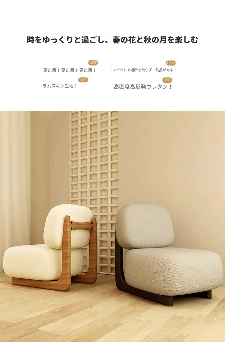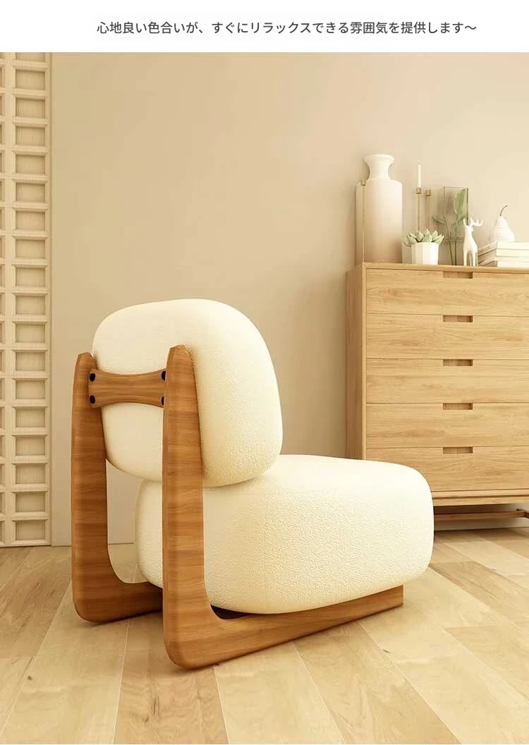 新しいモダンな無垢材のリラックスソファチェア - 侘寂風デザイン、アルパカファー使用、居心地の良い背もたれ付き。リビング、寝室、バルコニーにぴったりのカジュアルな休憩椅子!