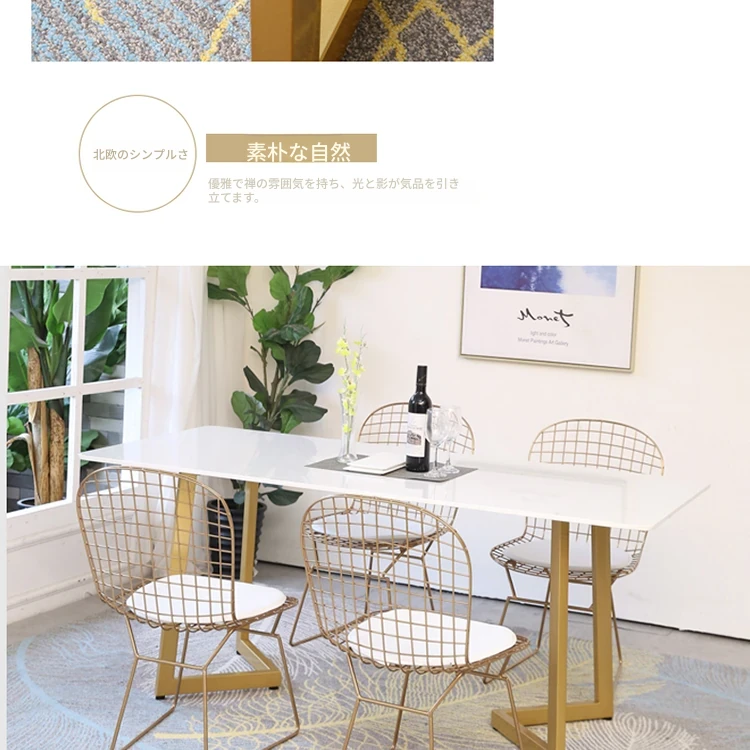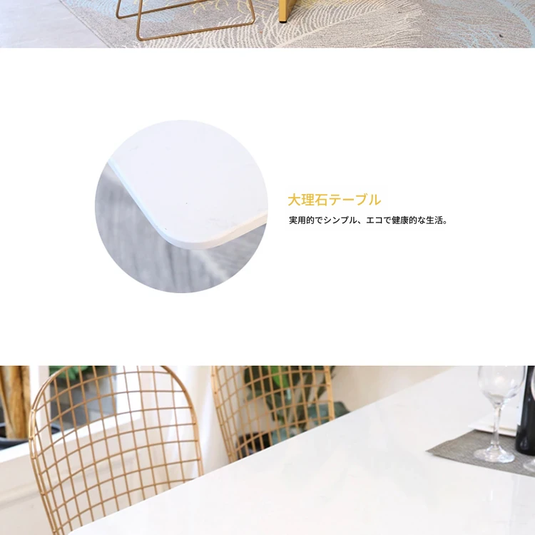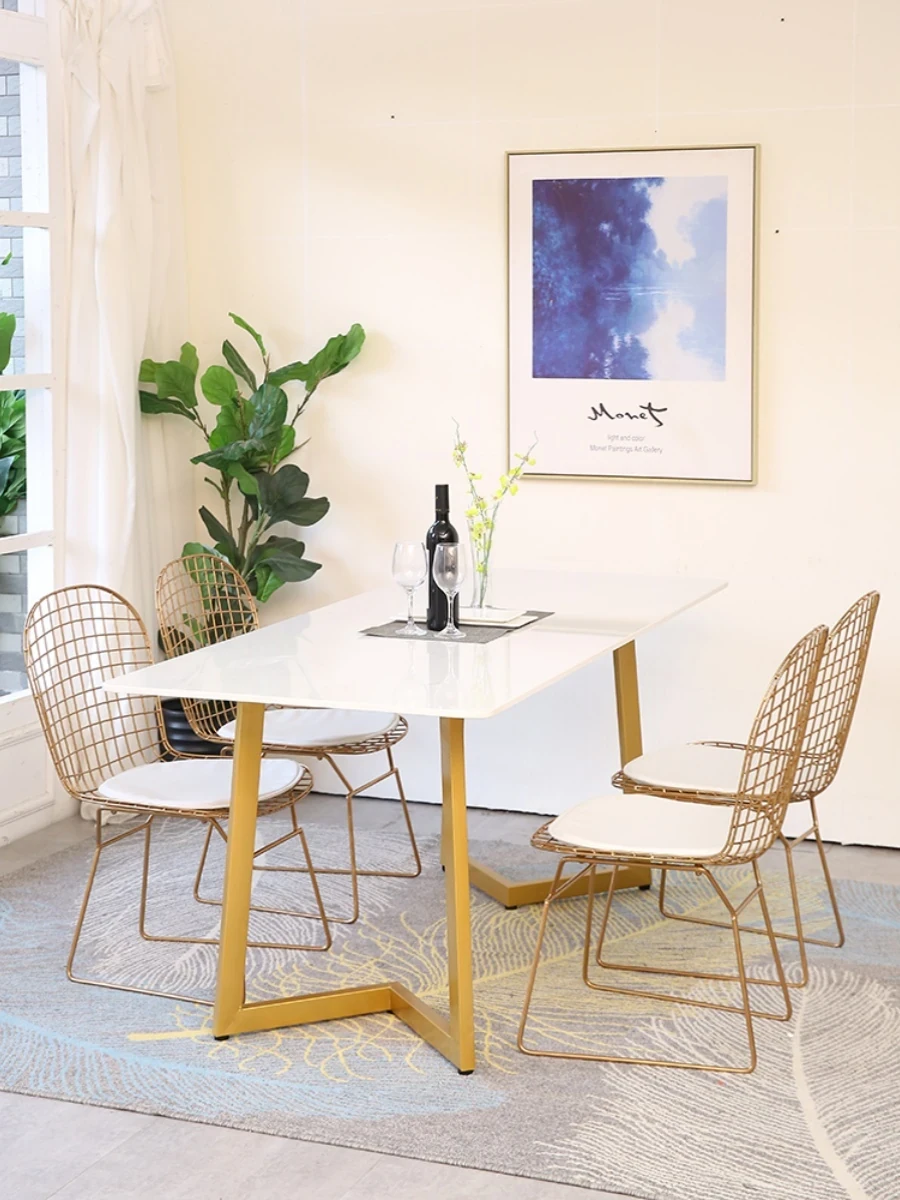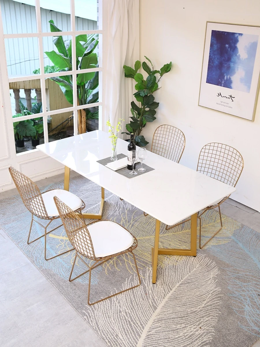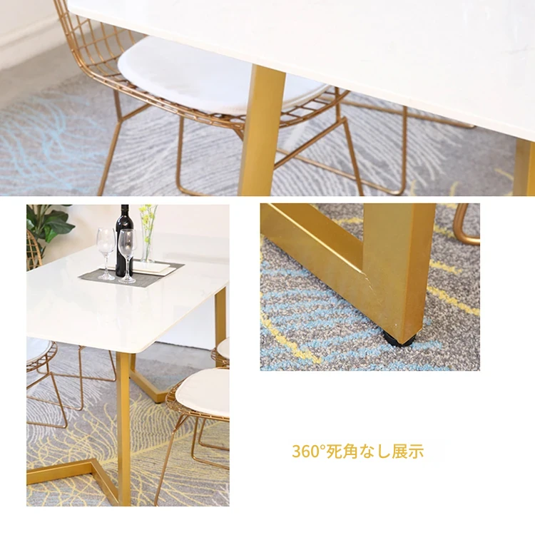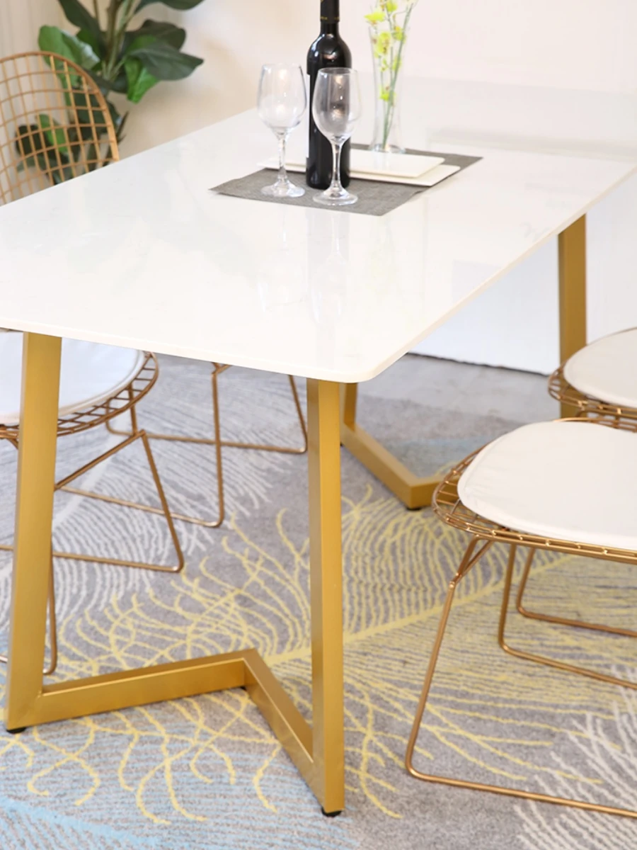 北欧スタイルの大理石ダイニングテーブル&チェアセット - ラグジュアリーな金色アイアンフレーム、コンパクトな長方形デザインで小さなリビングにもぴったり!おしゃれな食卓を演出します。