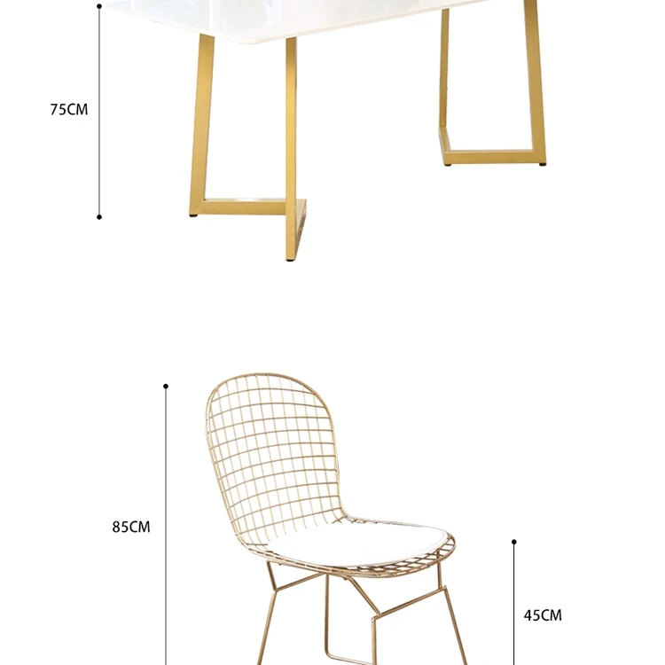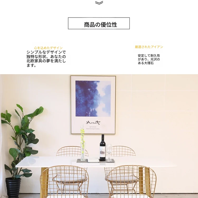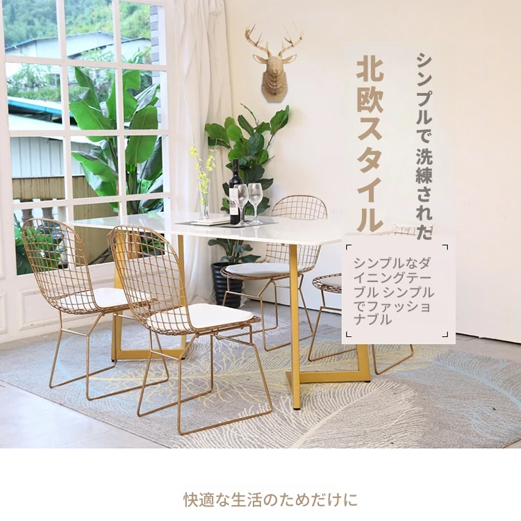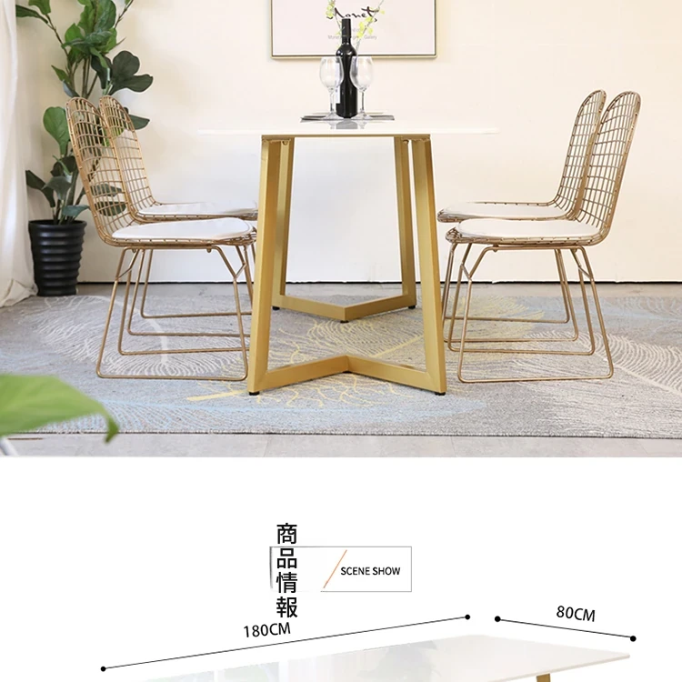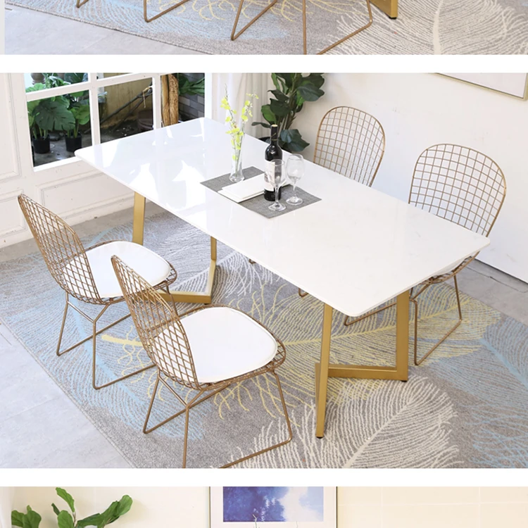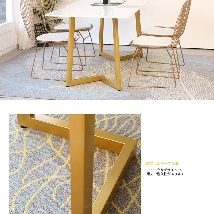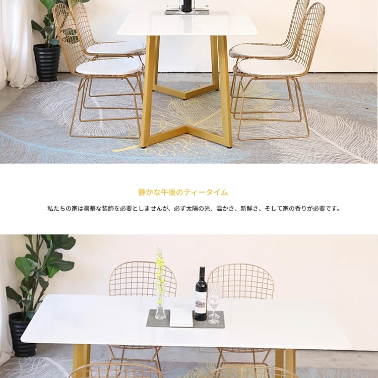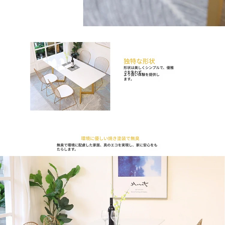 北欧スタイルの大理石ダイニングテーブル&チェアセット - ラグジュアリーな金色アイアンフレーム、コンパクトな長方形デザインで小さなリビングにもぴったり!おしゃれな食卓を演出します。