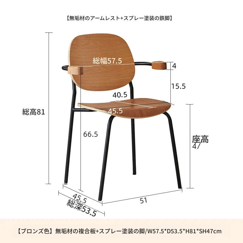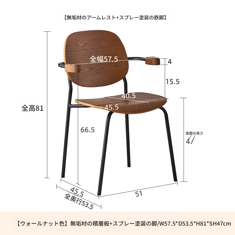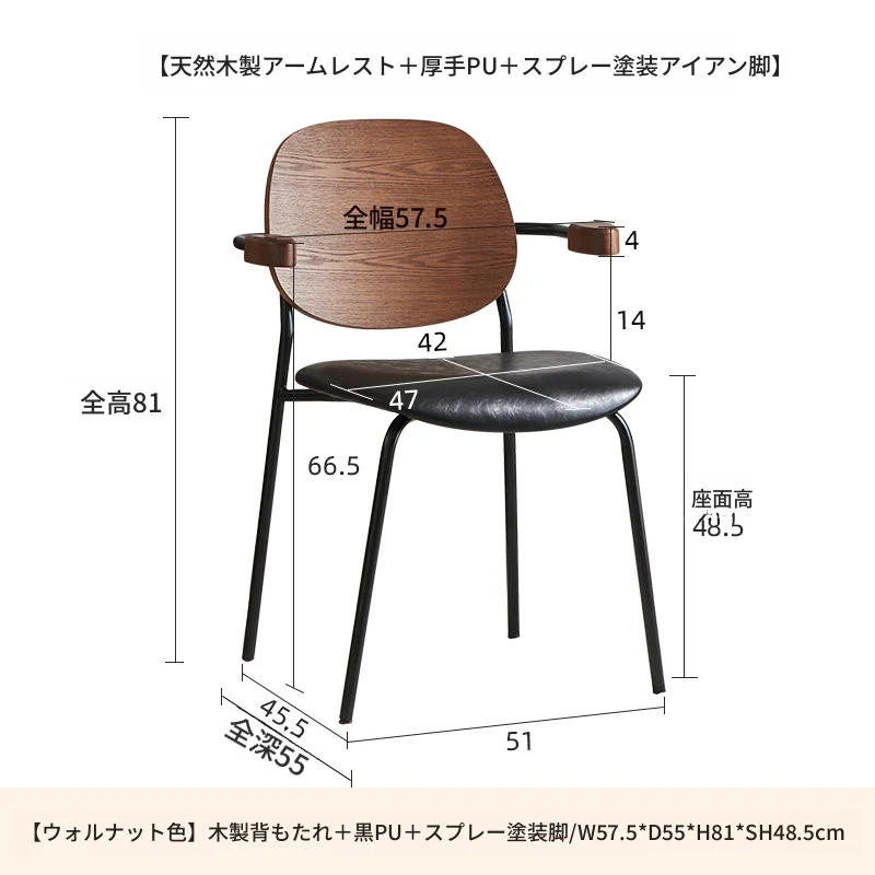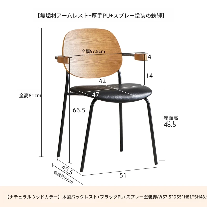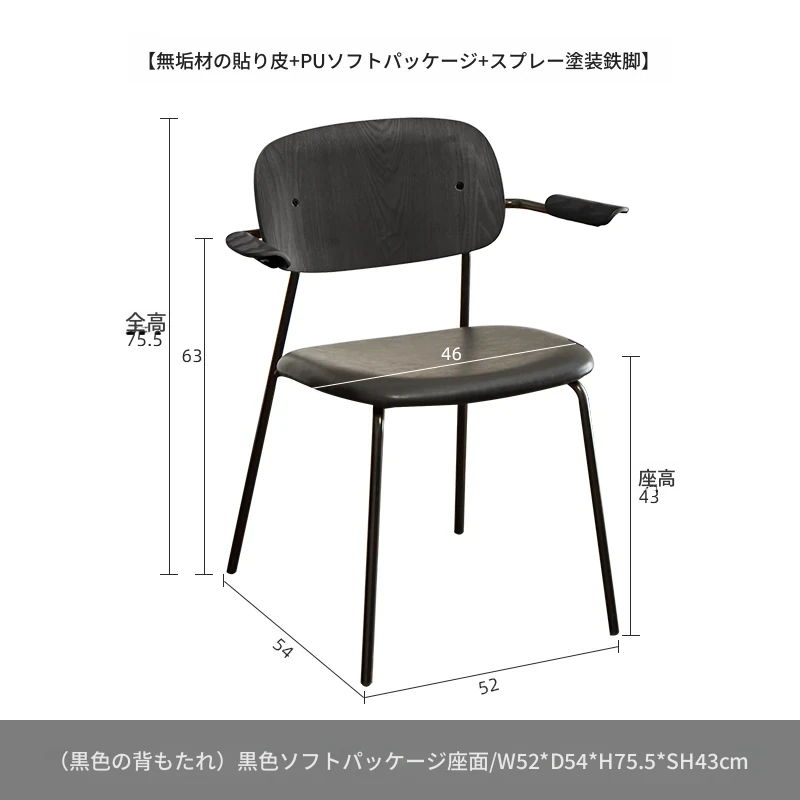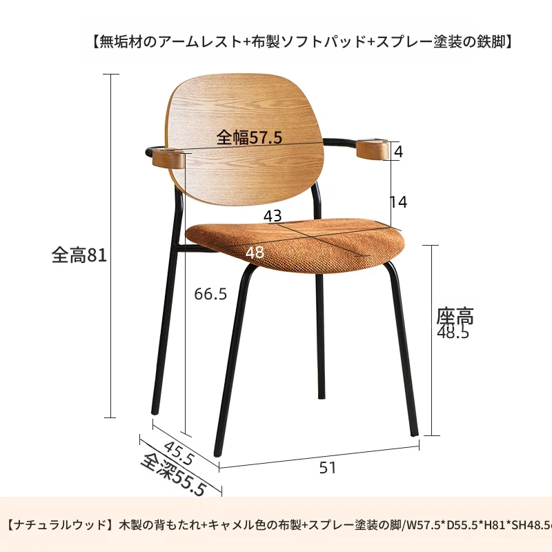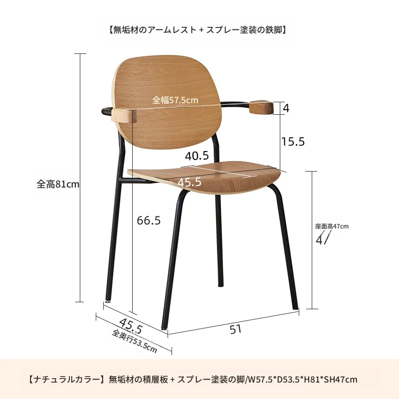 アームレストなしナチュラルウッド色背もたれ黒色クッションスプレー塗装鉄脚
