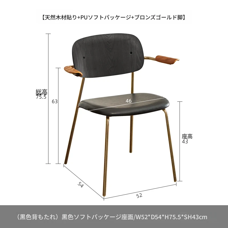 アームレスト付き黒色クッション+黒色背もたれ古銅金脚