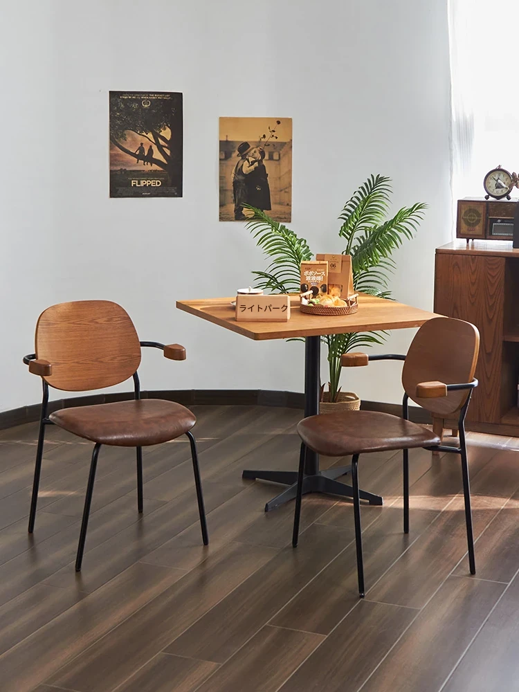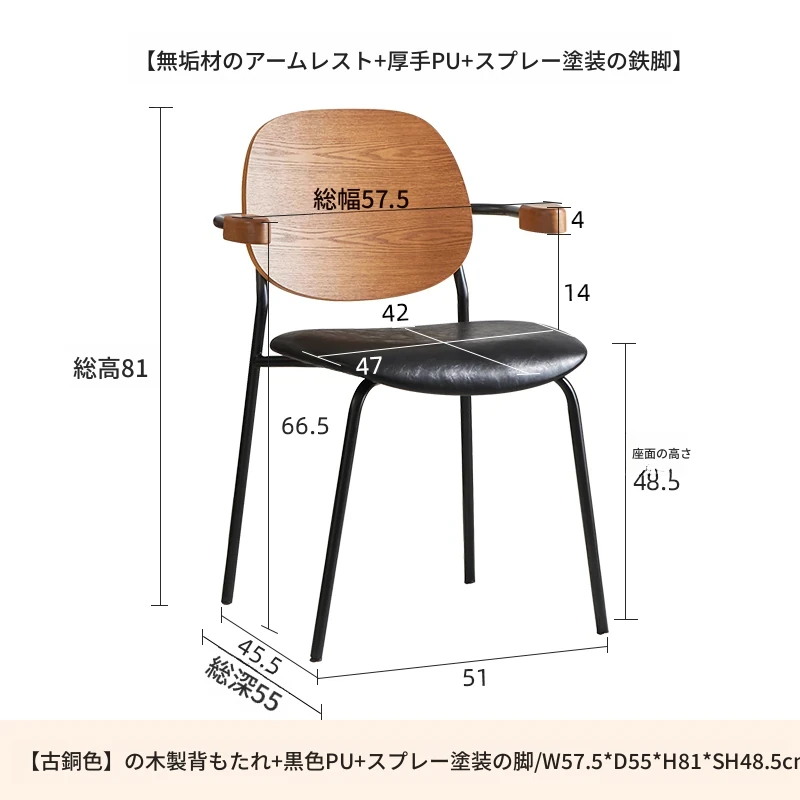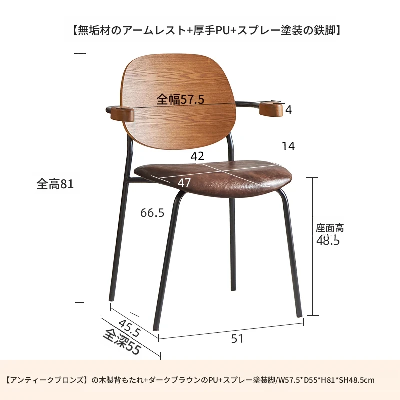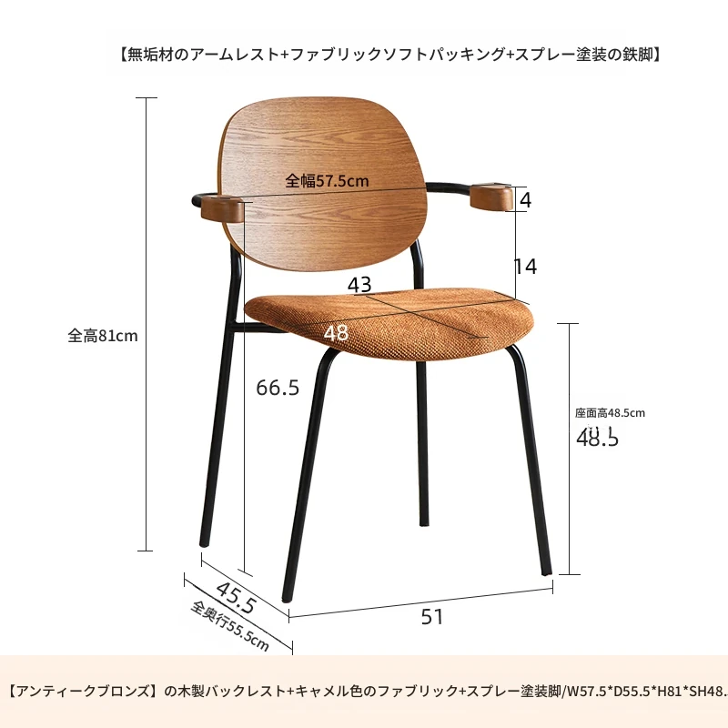 アームレスト付き古銅色背もたれ黒色クッションスプレー塗装鉄脚