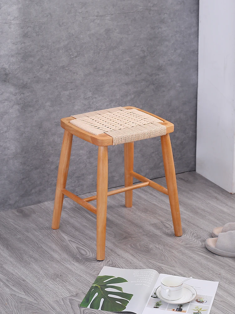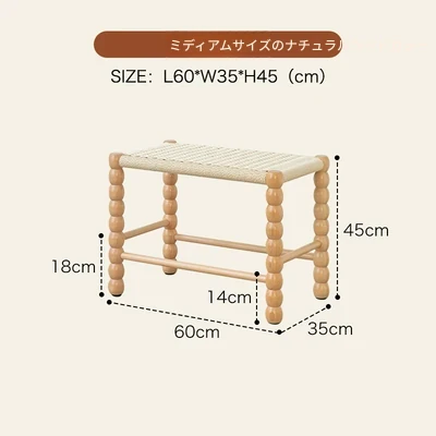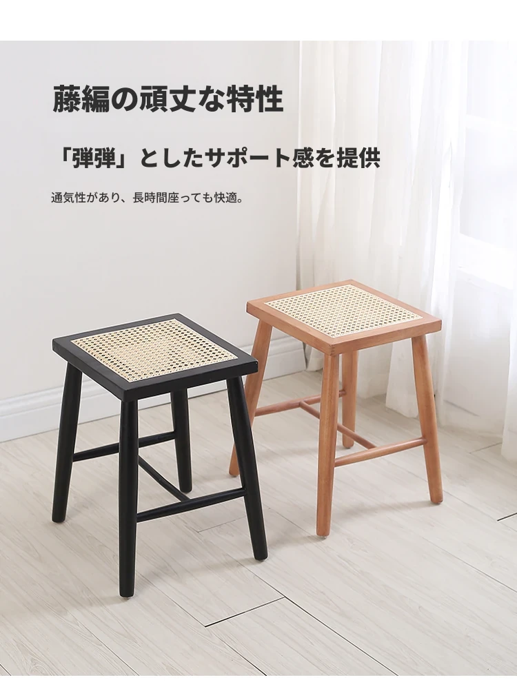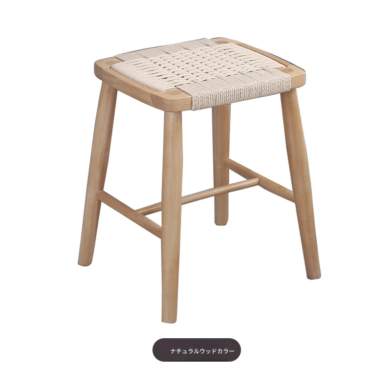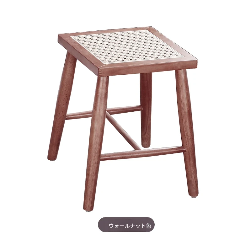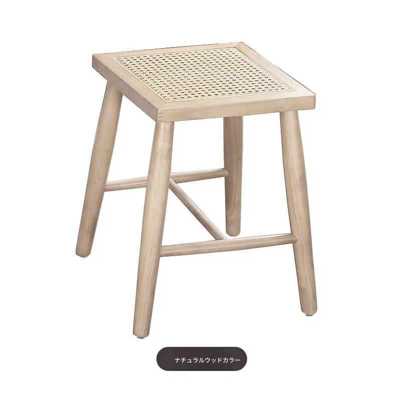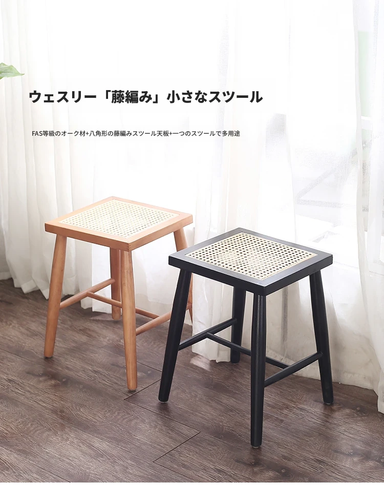 北欧スタイルの実木製ドレッシングスツール - 藤編みのシンプルなデザイン、リビングや寝室にぴったり!オーク材使用で高級感漂う小さな椅子。化粧やリラックスタイムに最適なアイテムです。