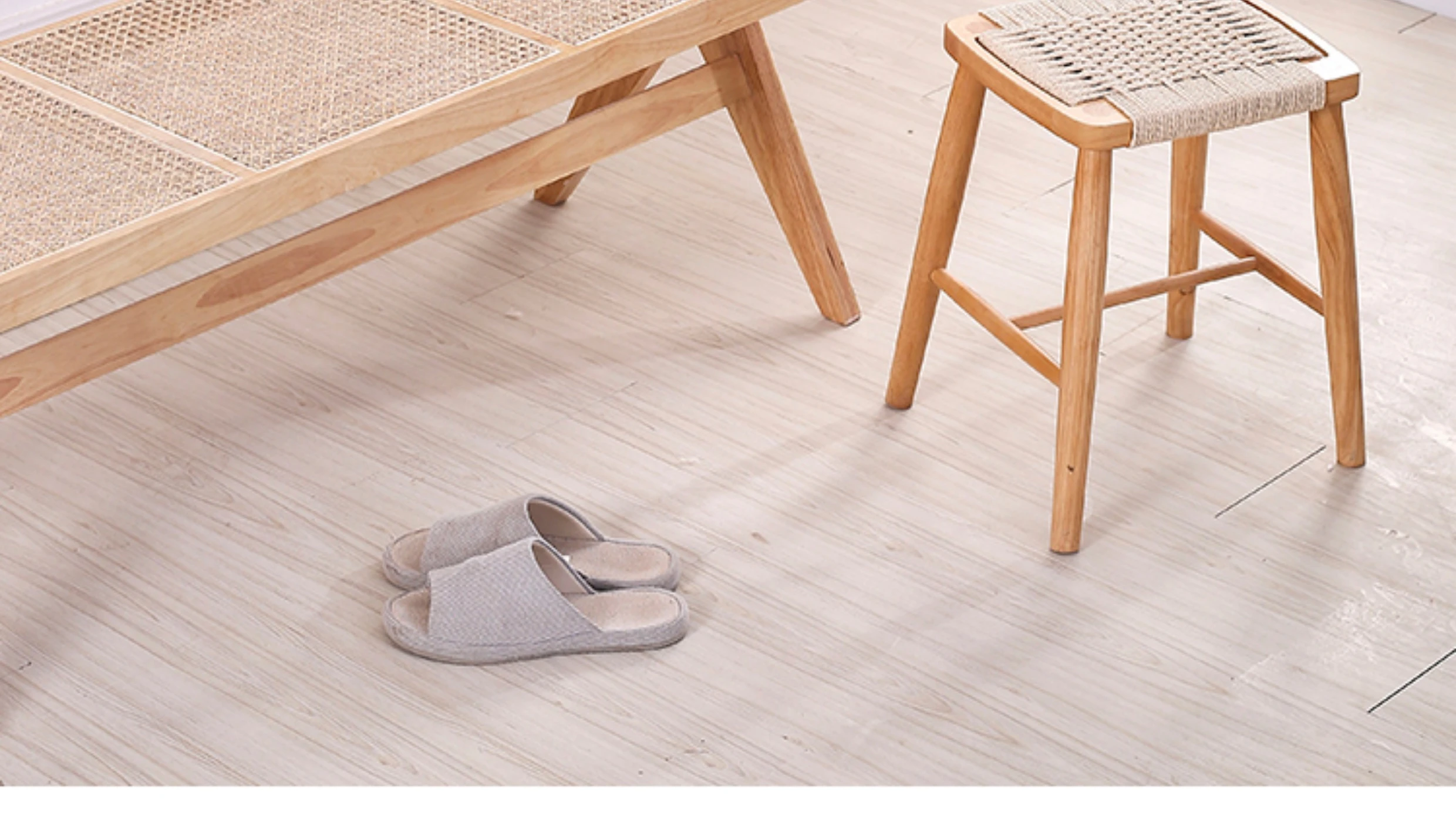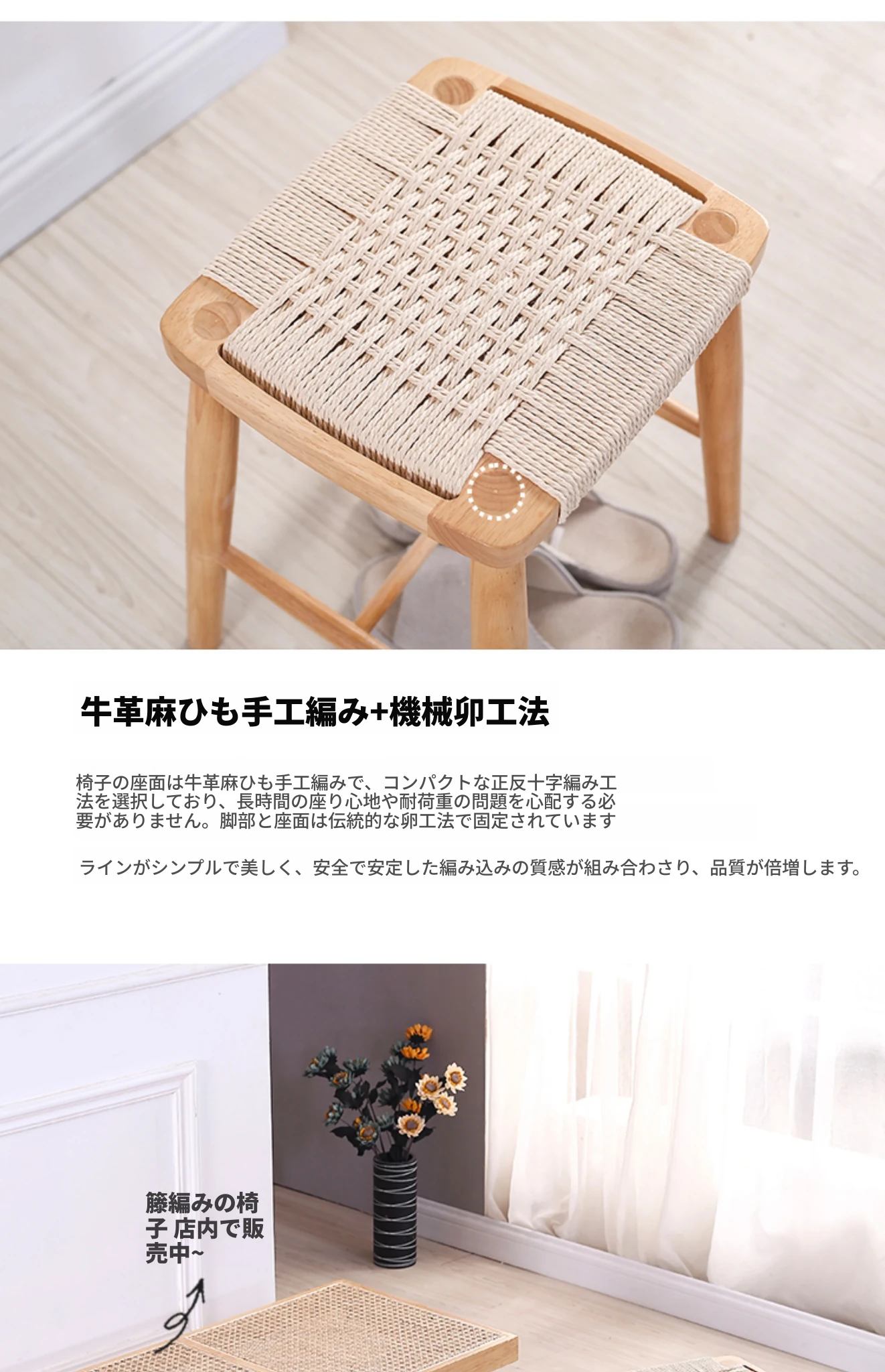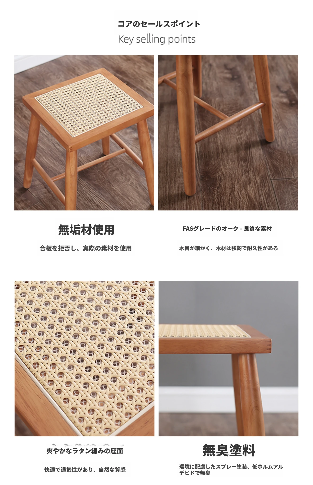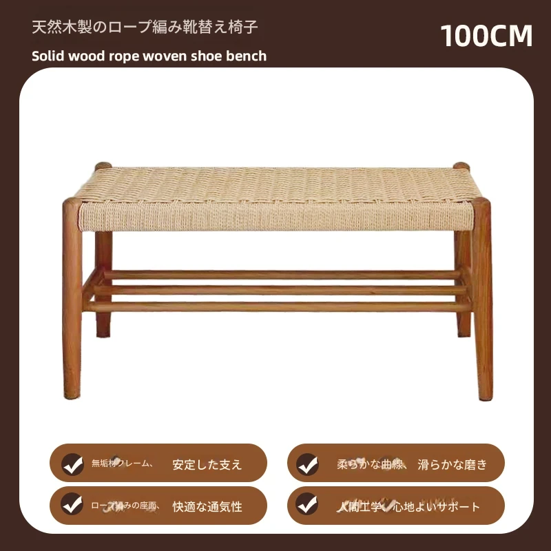 北欧スタイルの実木製ドレッシングスツール - 藤編みのシンプルなデザイン、リビングや寝室にぴったり!オーク材使用で高級感漂う小さな椅子。化粧やリラックスタイムに最適なアイテムです。