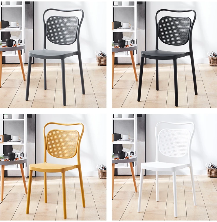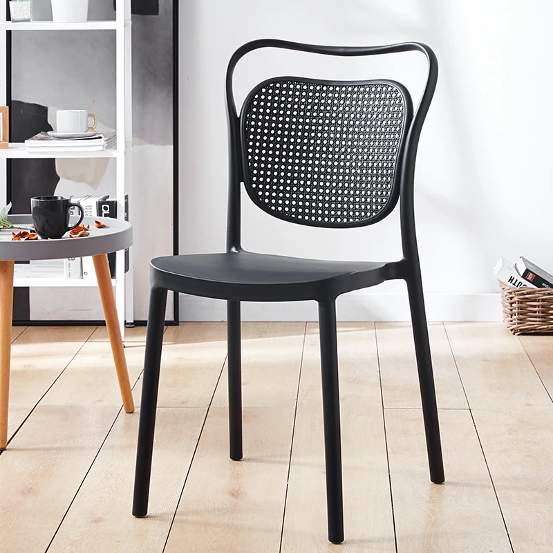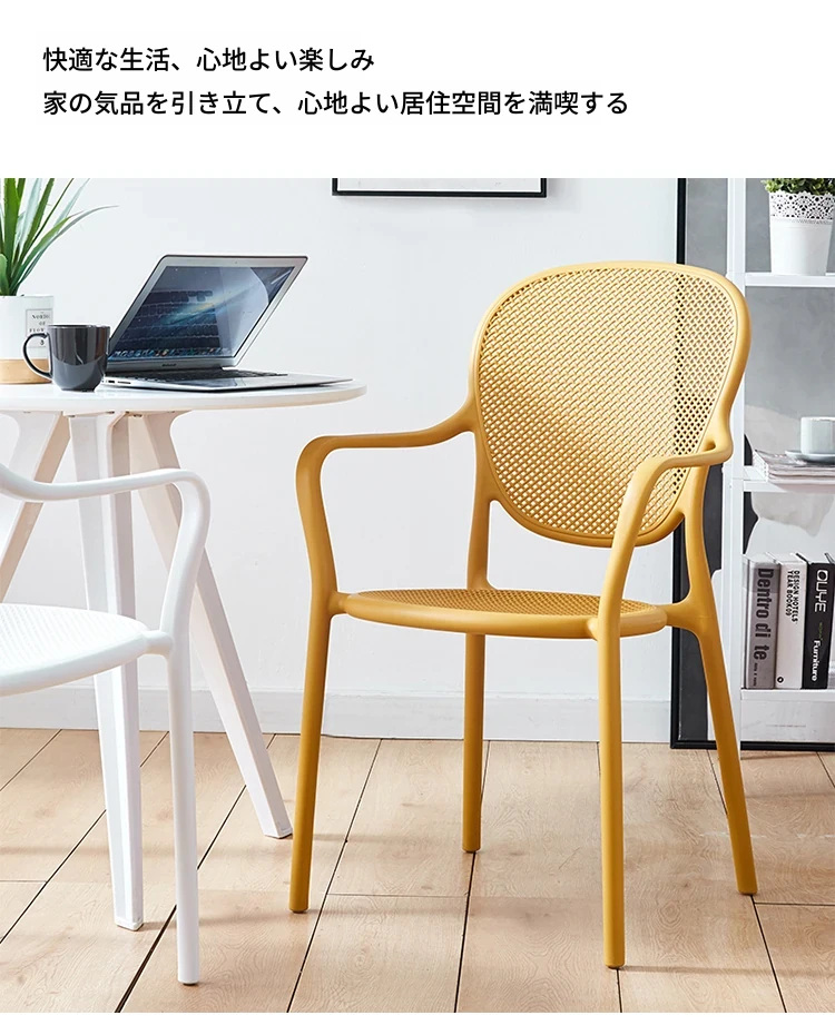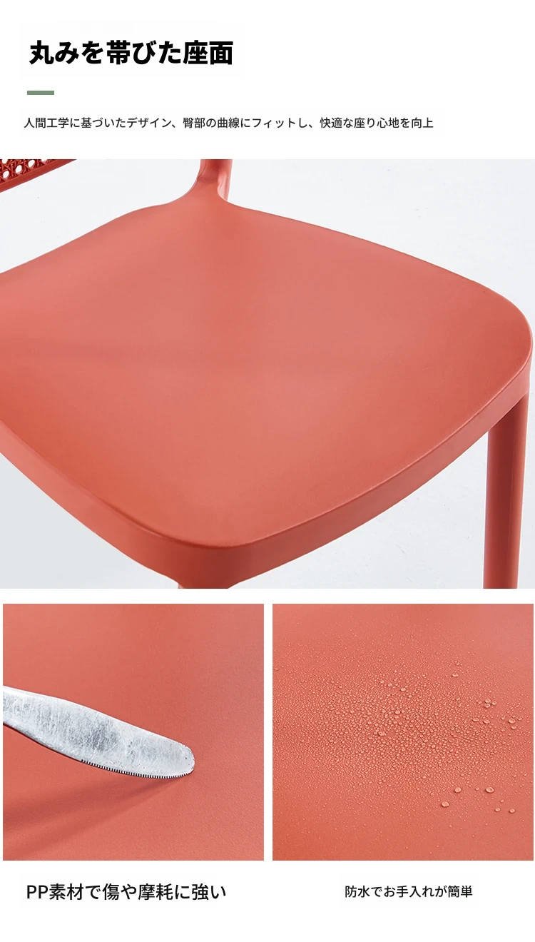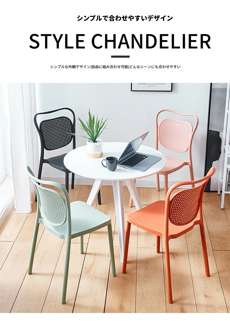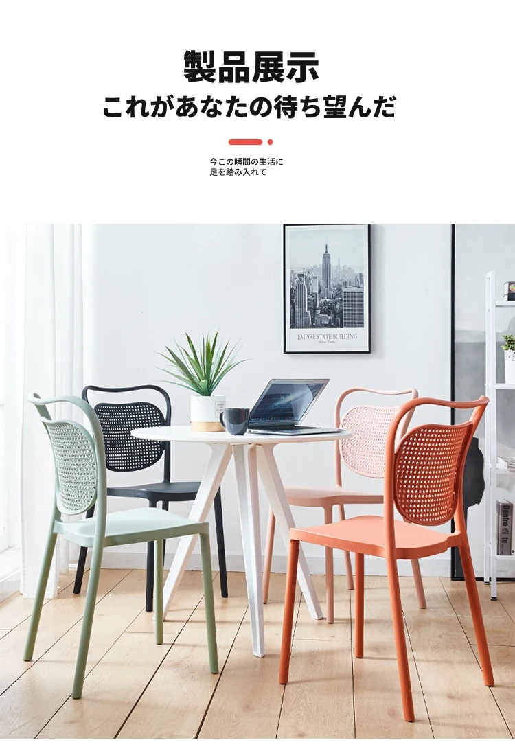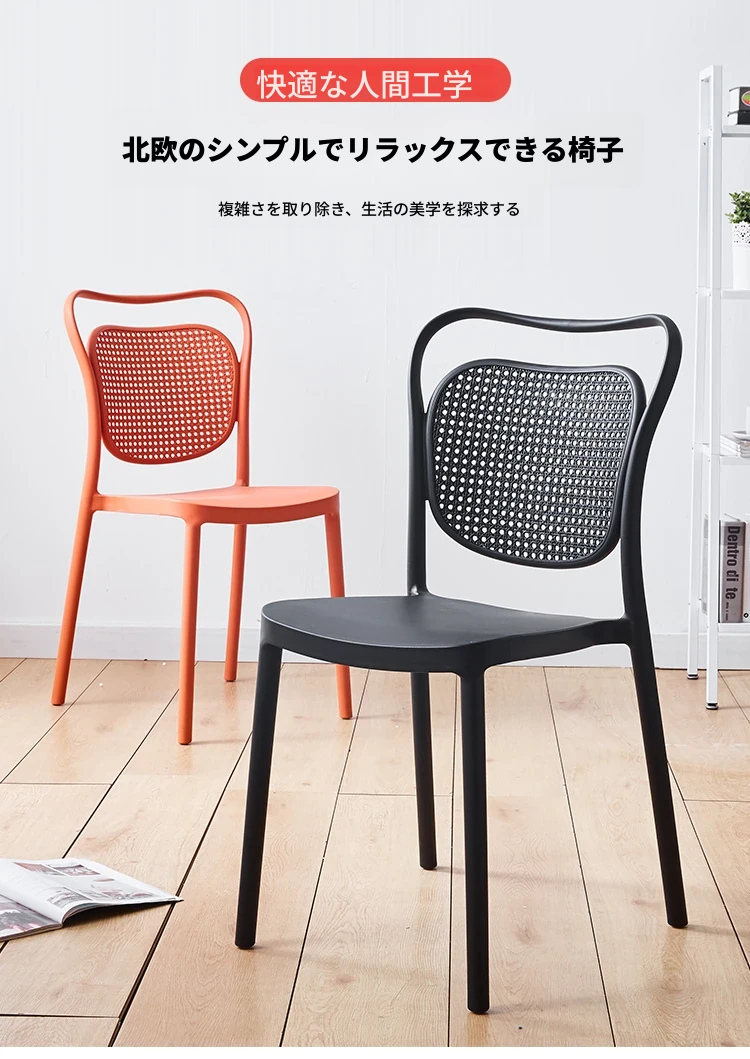 北欧風デザインの家庭用プラスチック製チェア、背もたれ付きのスタイリッシュな厚手シート!流行のレーザーカットデザインで、スタッキング可能なモダンな会議用チェア。シンプルでありながら機能的、あなたのスペースに最適な一脚です!