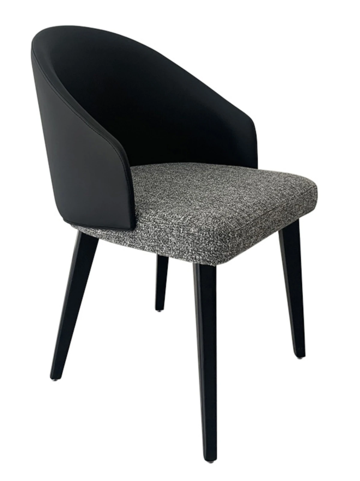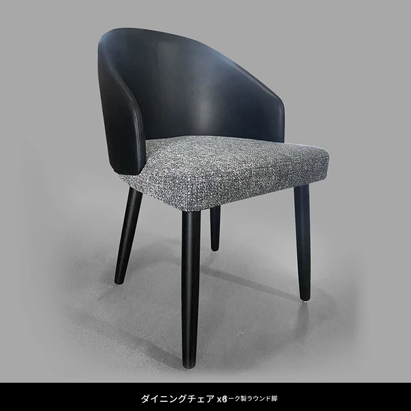 肘付きダイニングチェア ブラックの皮+布 オークの丸脚