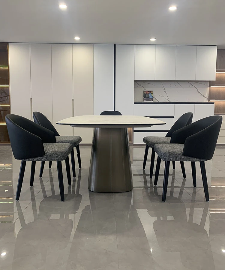 肘付きダイニングチェア ダークグレーの皮+布 オークの丸脚