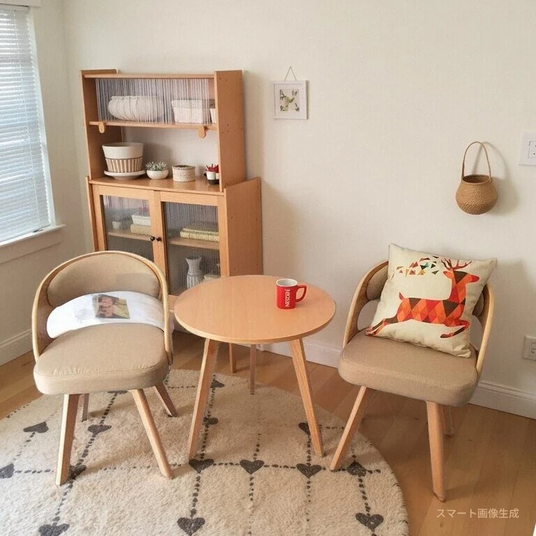 ローテーブル+2つのベージュ布製椅子 ローテーブル直径60 高さ60