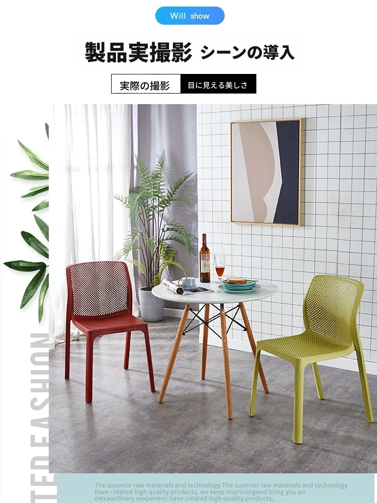 北欧風の厚背もたれプラスチックチェア – シンプルでスタイリッシュなデザイン、屋外やバルコニーに最適!省スペースで重ねられるので、小さなダイニングルームにもぴったりです。快適な座り心地を実現!